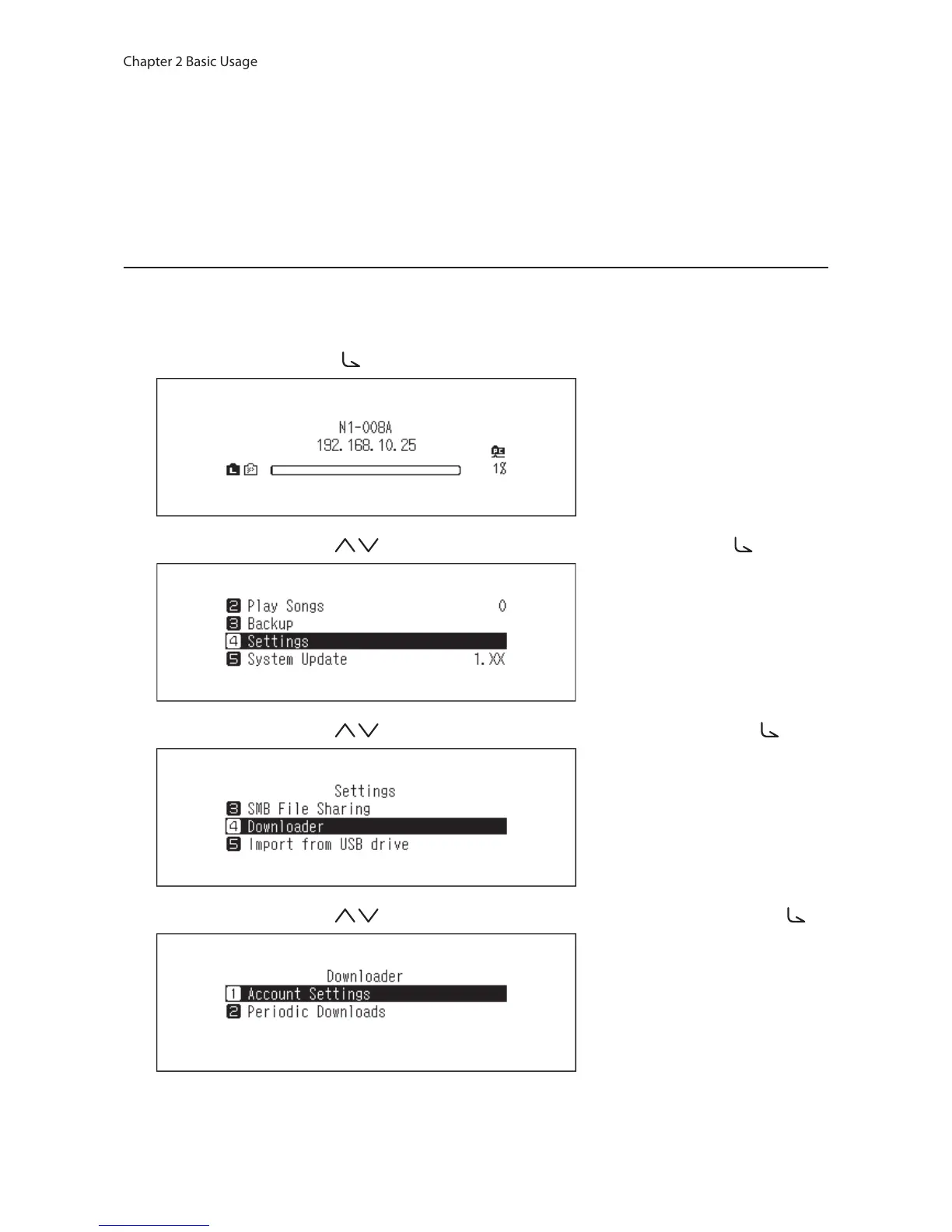 4 Press the Up/Down buttons ( ) and select “Downloader”, then press the Menu/Enter button ( ).