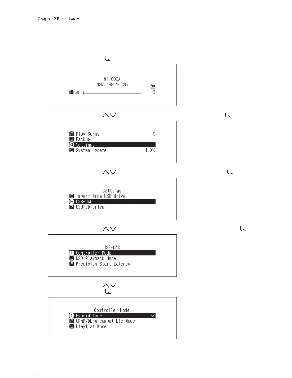 3 Press the Up/Down buttons ( ) and select “USB-DAC”, then press the Menu/Enter button ( ).