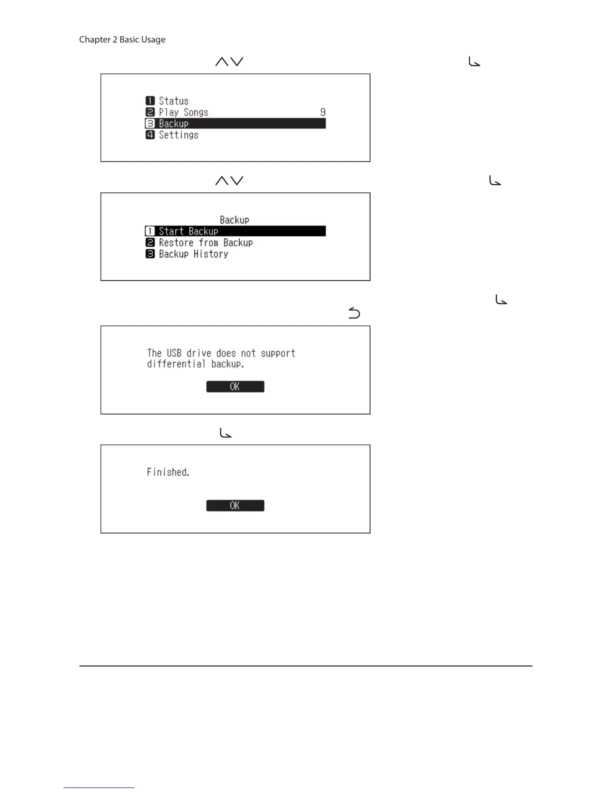 6 Press the Up/Down buttons ( ) and select “Start Backup”, then press the Menu/Enter button ( ).