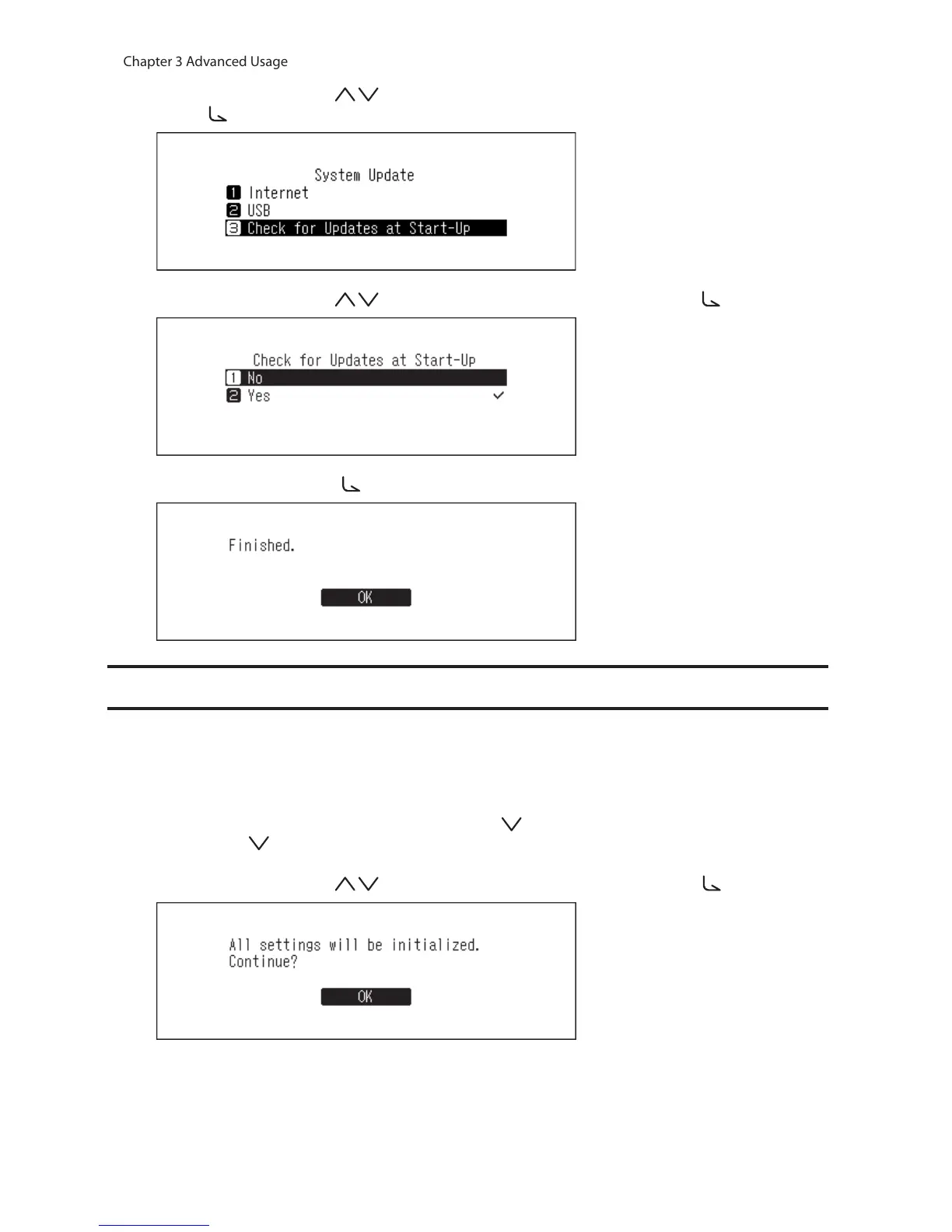 3 Press the Up/Down buttons ( ) and select “Check for Updates at Start-Up”, then press the Menu/Enter