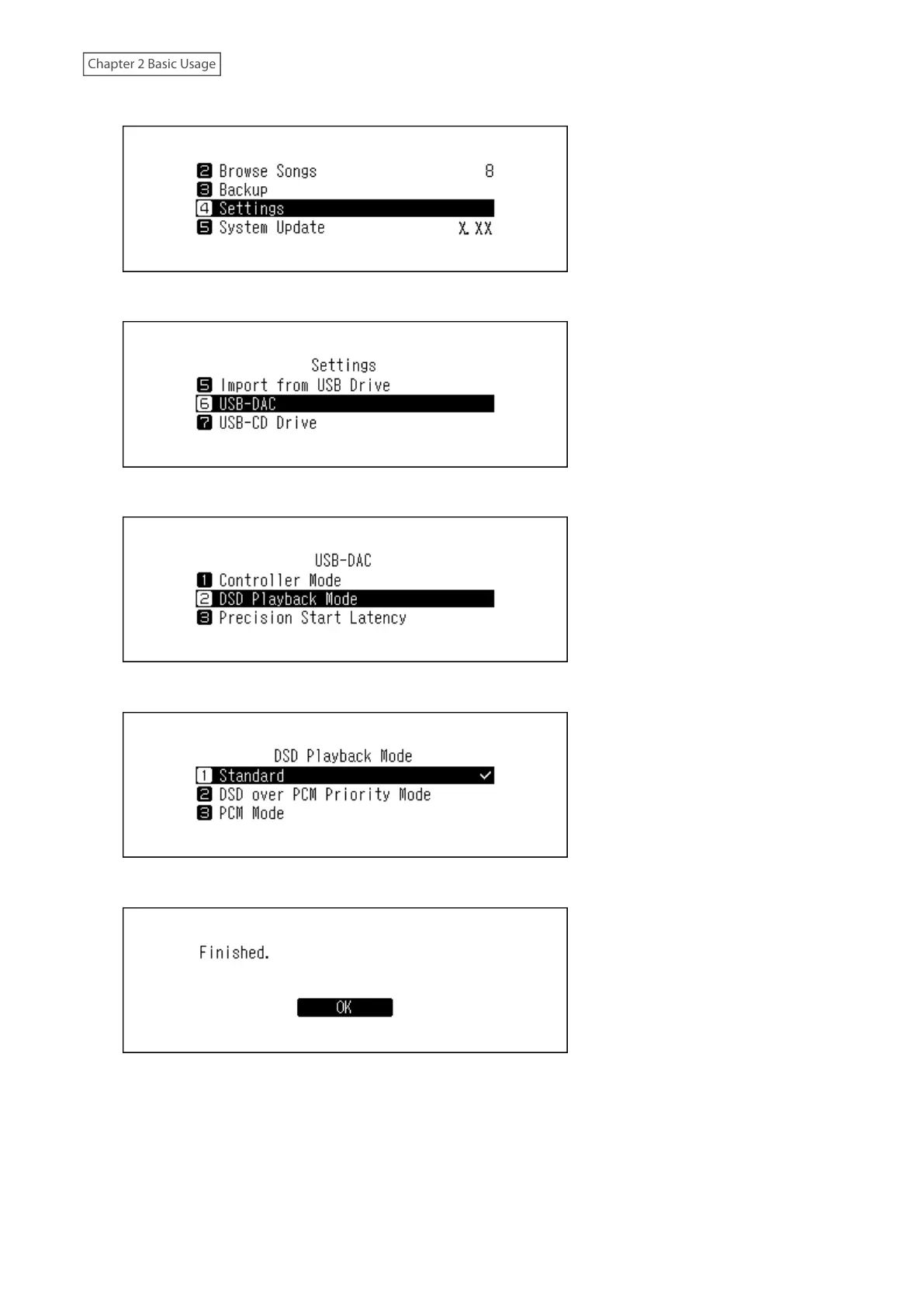 3 Press the Up/Down buttons and select “USB-DAC”, then press the Menu/Enter button.