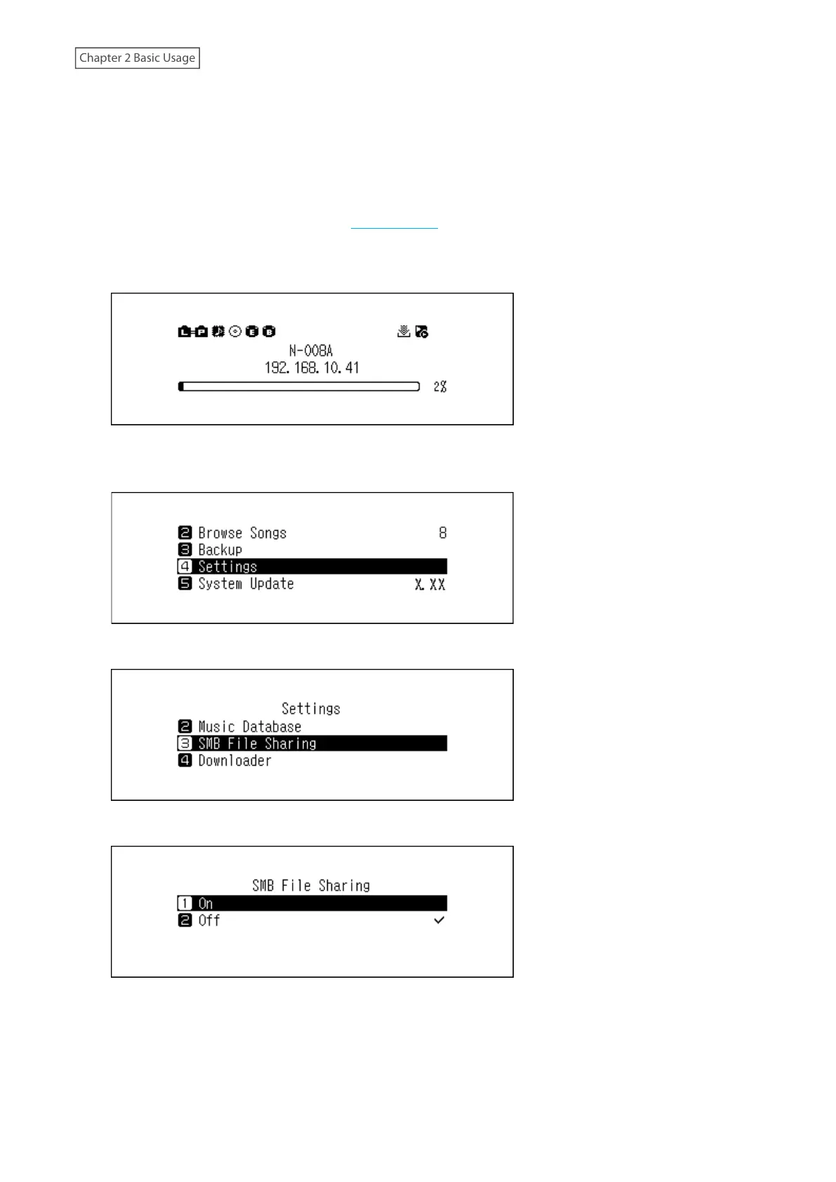 3 Press the Up/Down buttons and select “SMB File Sharing”, then press the Menu/Enter button.