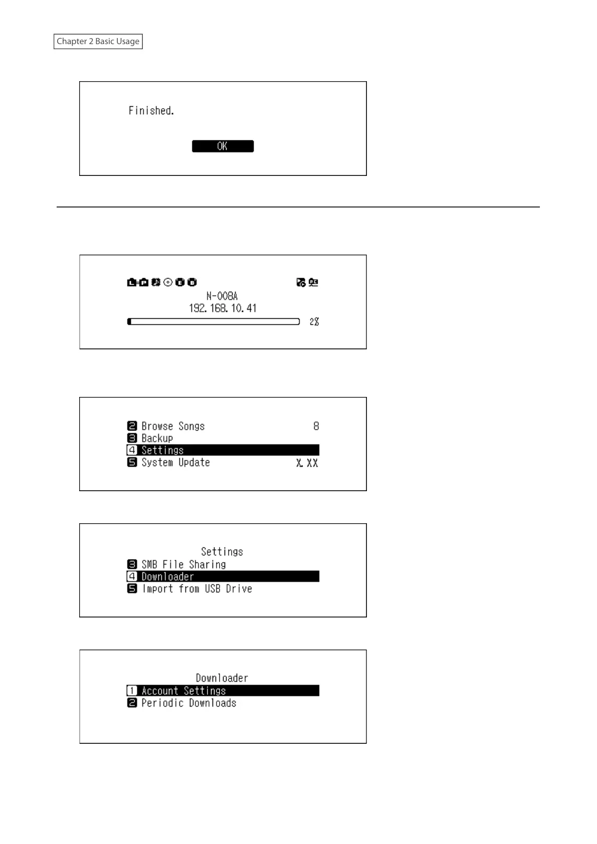 3 Press the Up/Down buttons and select “Downloader, then press the Menu/Enter button.