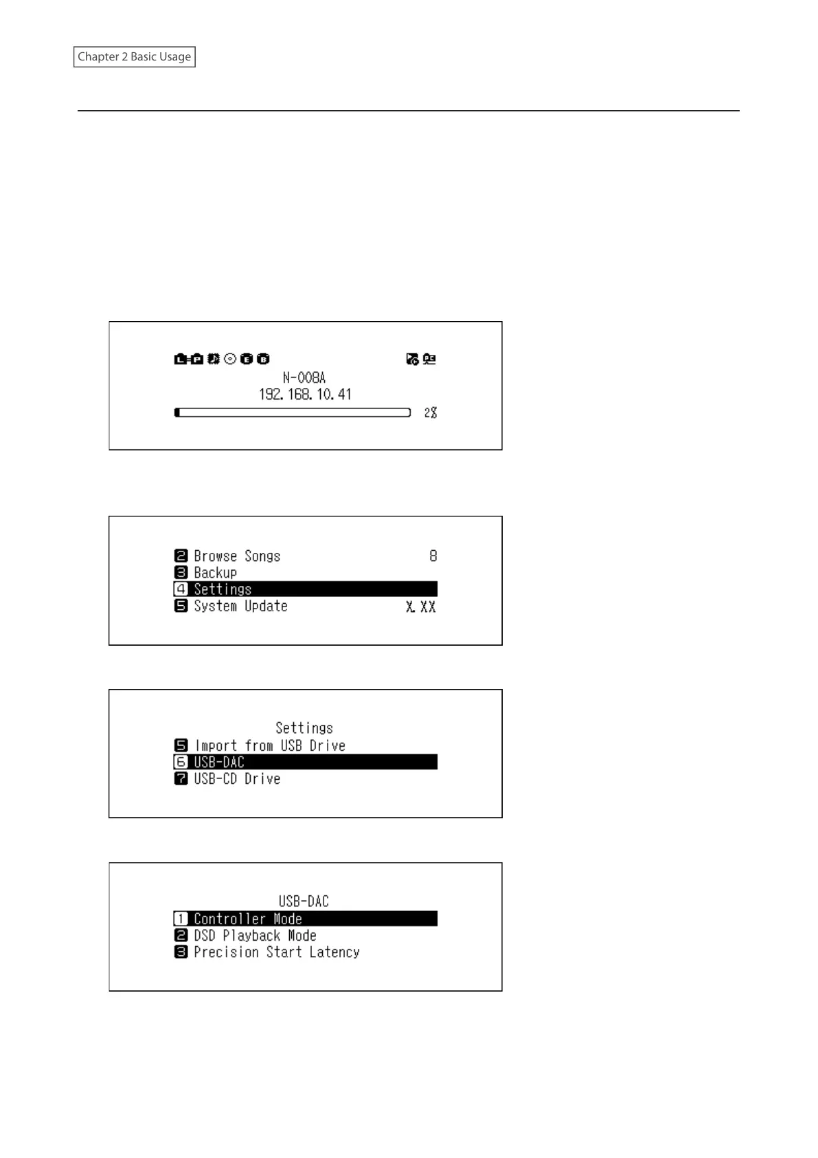 3 Press the Up/Down buttons and select “USB-DAC”, then press the Menu/Enter button.