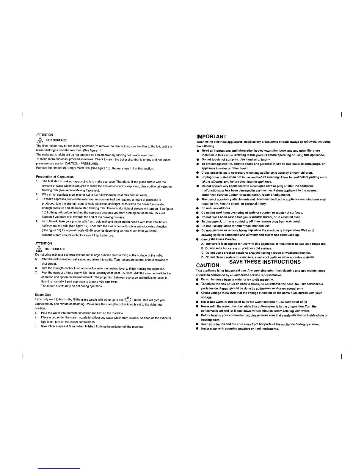 Mellerware 29001 - Making Cappuccino and Espresso; Cappuccino Preparation Steps; Steam Only Function; General Safety Precautions