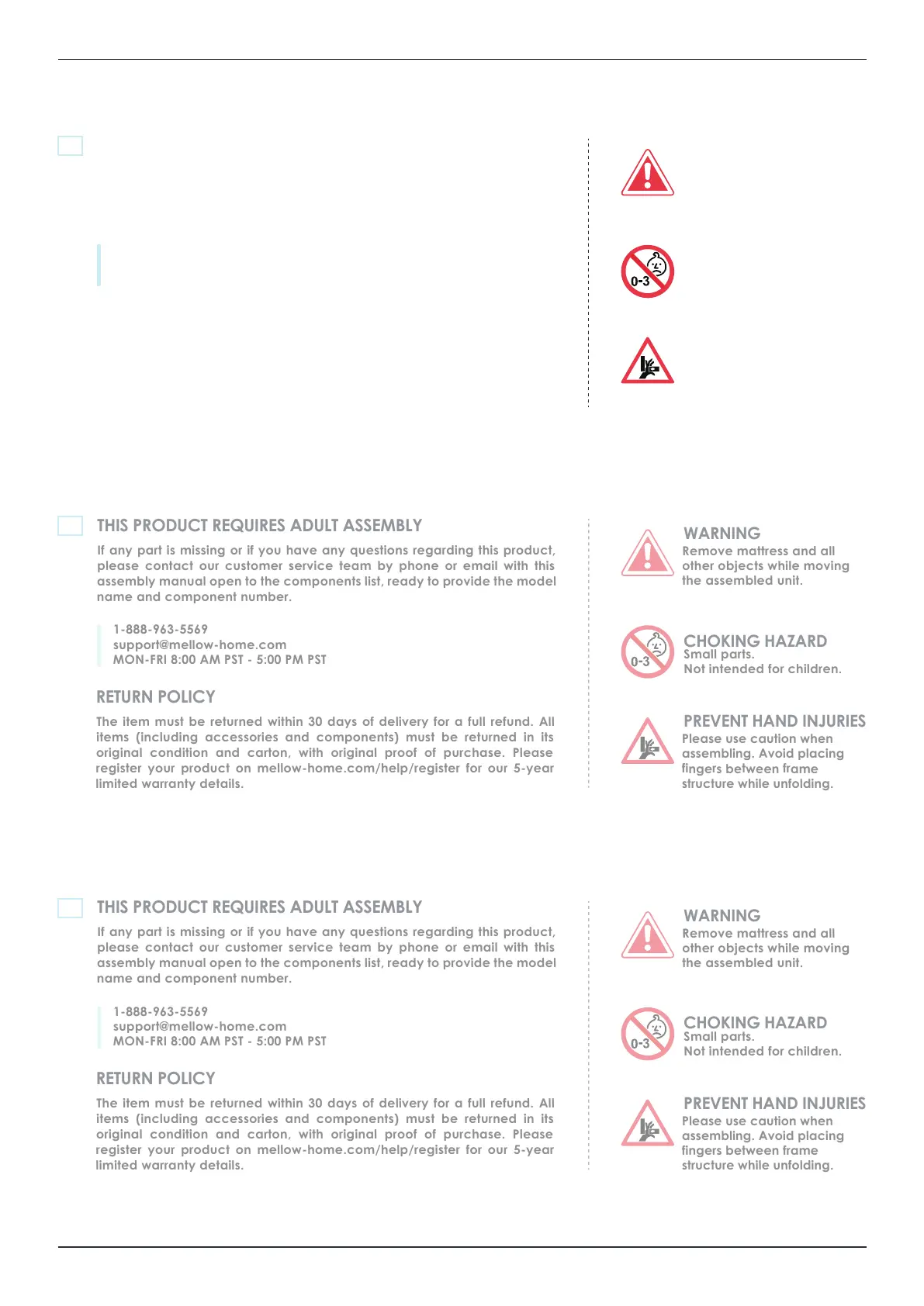 MELLOW rocky base E - Important Safety and Policy Information; Adult Assembly Requirement and Contact; Return Policy and Warranty Registration; General Safety Warnings