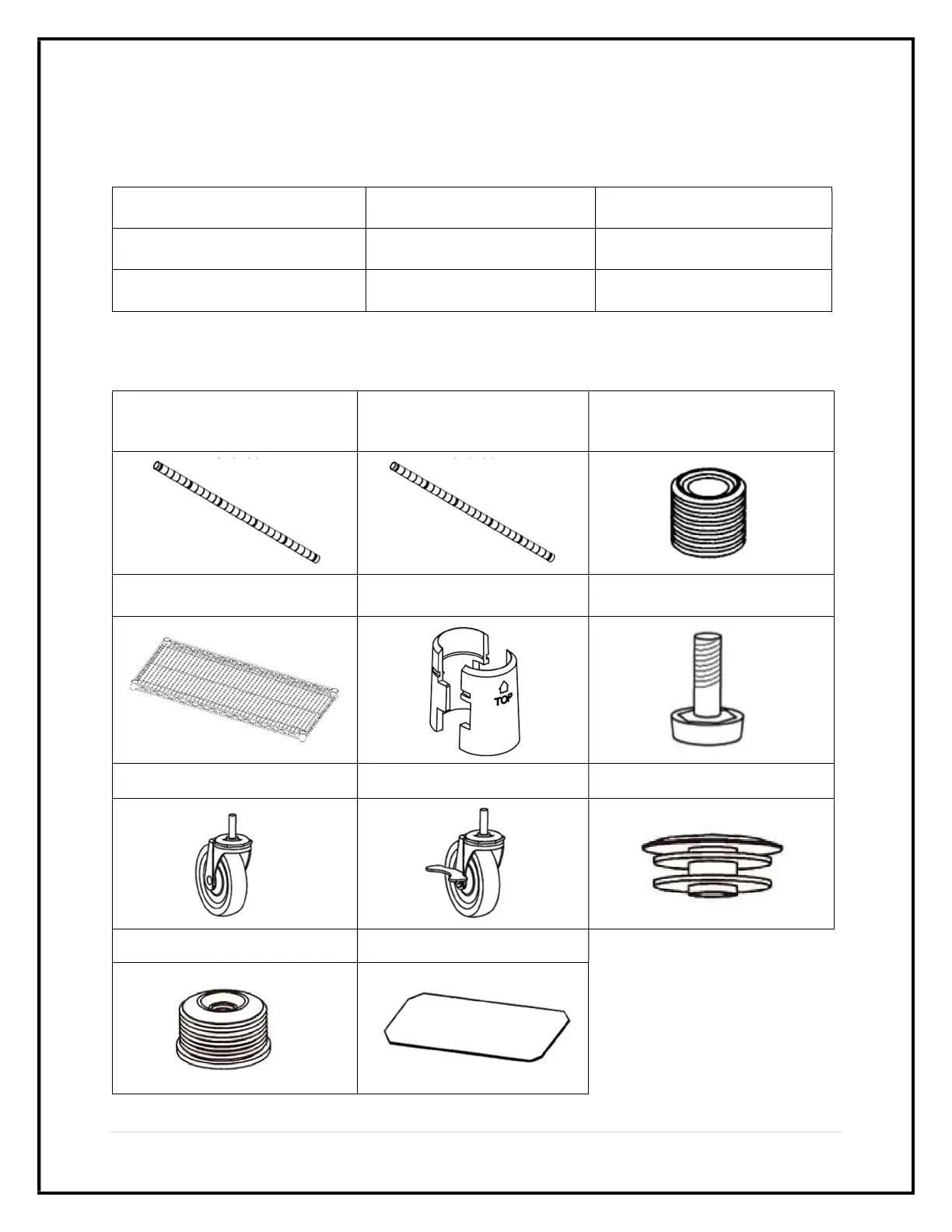 D. Shelves (6) E. Slip-sleeves (24) F. Leveling feet (8)