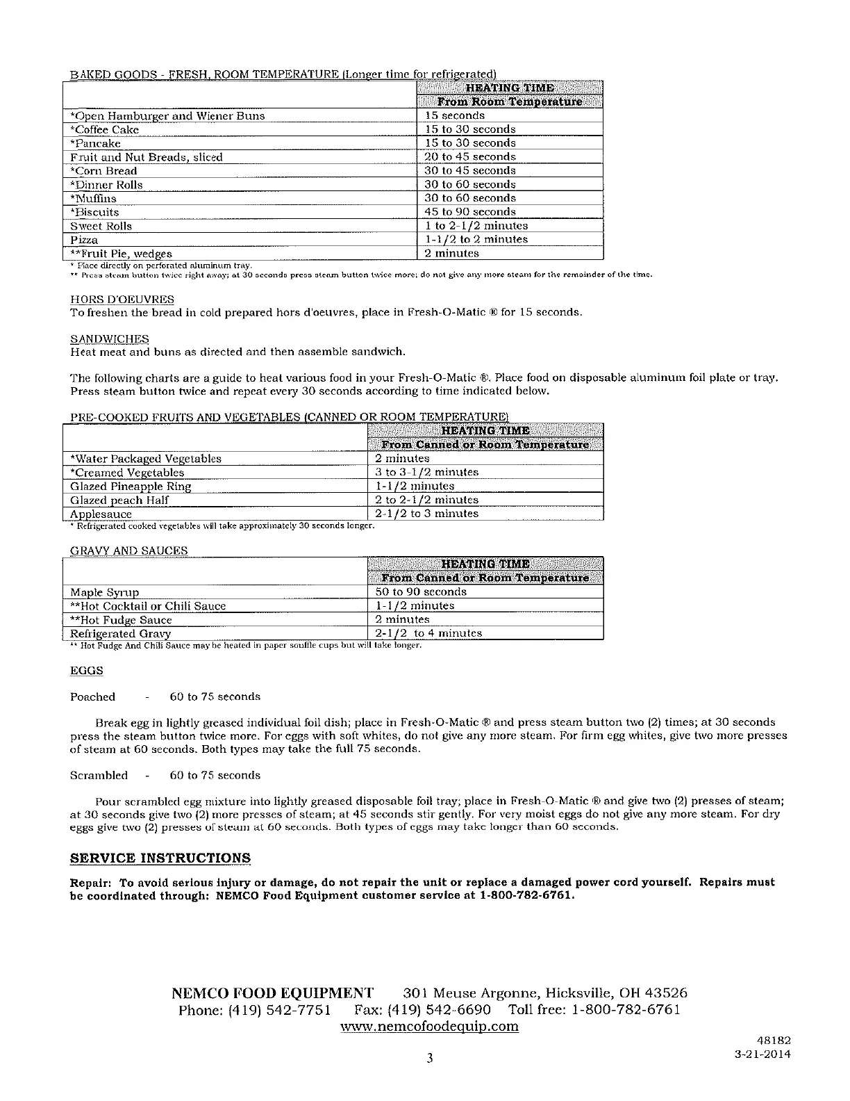 Memco 6625B - More Cooking Options and Service; Heating Time for Baked Goods; Heating Time for Fruits, Vegetables, Gravy, Sauces, and Eggs; Service Instructions