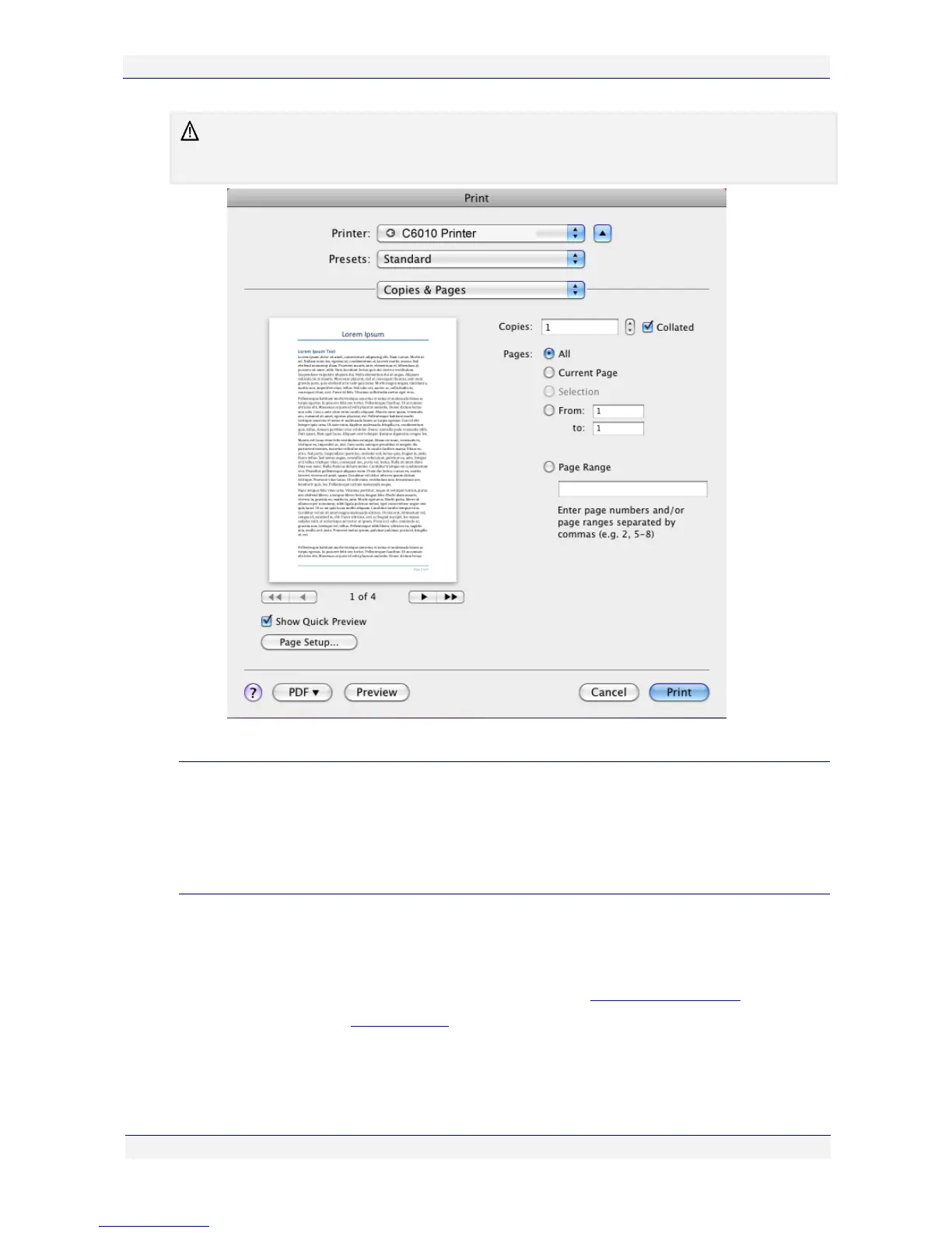 Print dialog box for Word for Mac 2011 is reproduced below as an example of the different