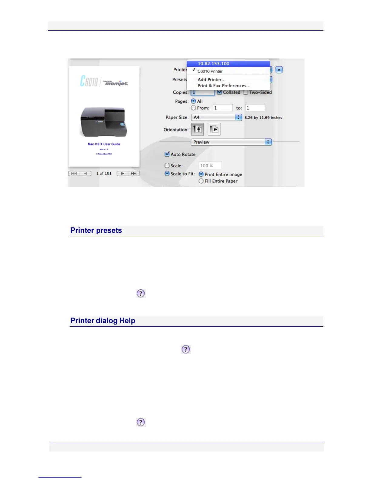 Clicking that icon will bring up either the MacOS X standard print dialog Help window or an