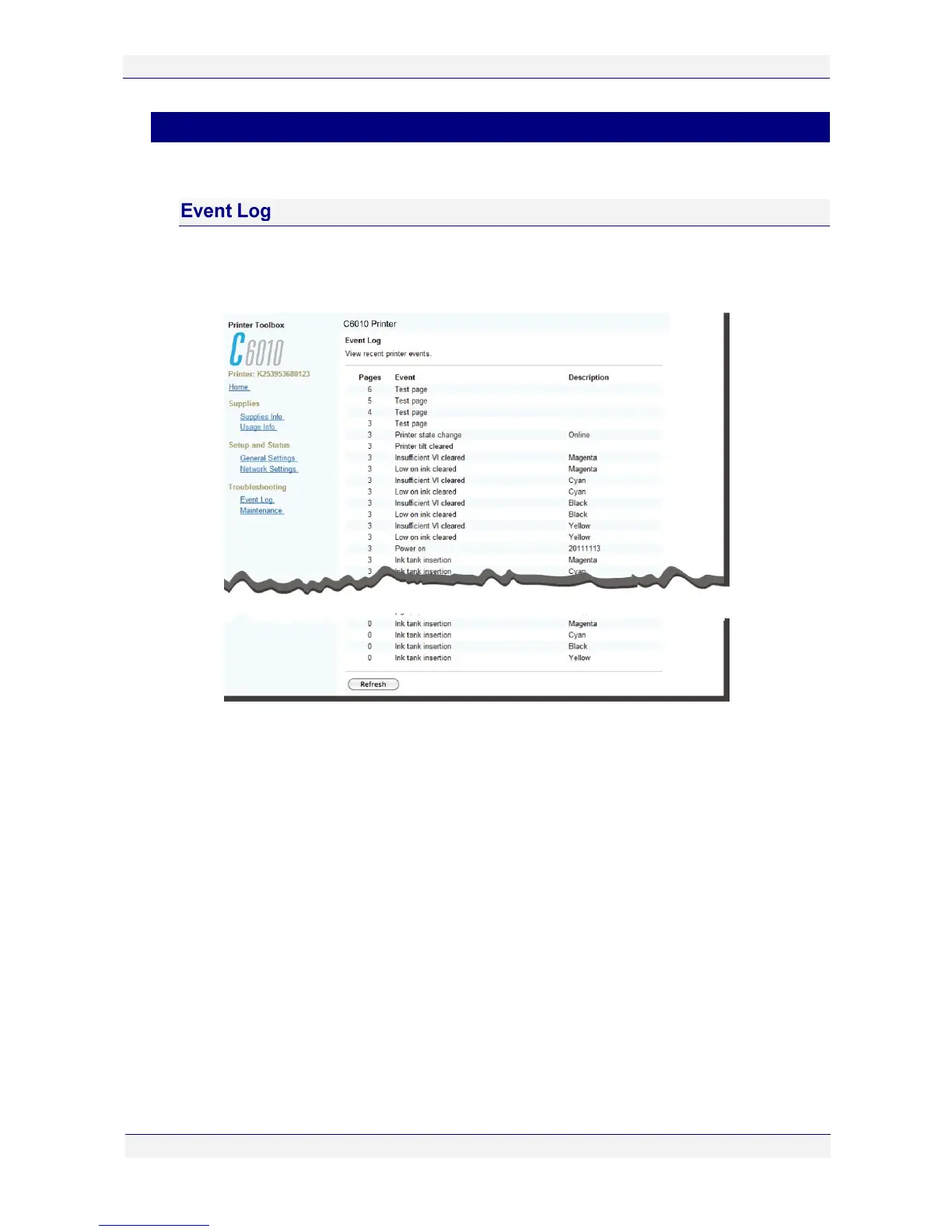 Your C6010 printer logs errors into a special buffer in printer memory. The Event Log screen