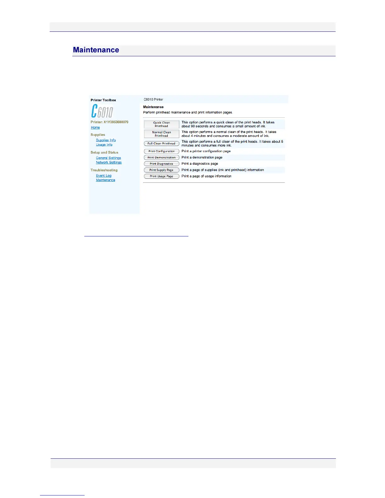 The Maintenance page allows you to clean the printhead and print various diagnostic pages