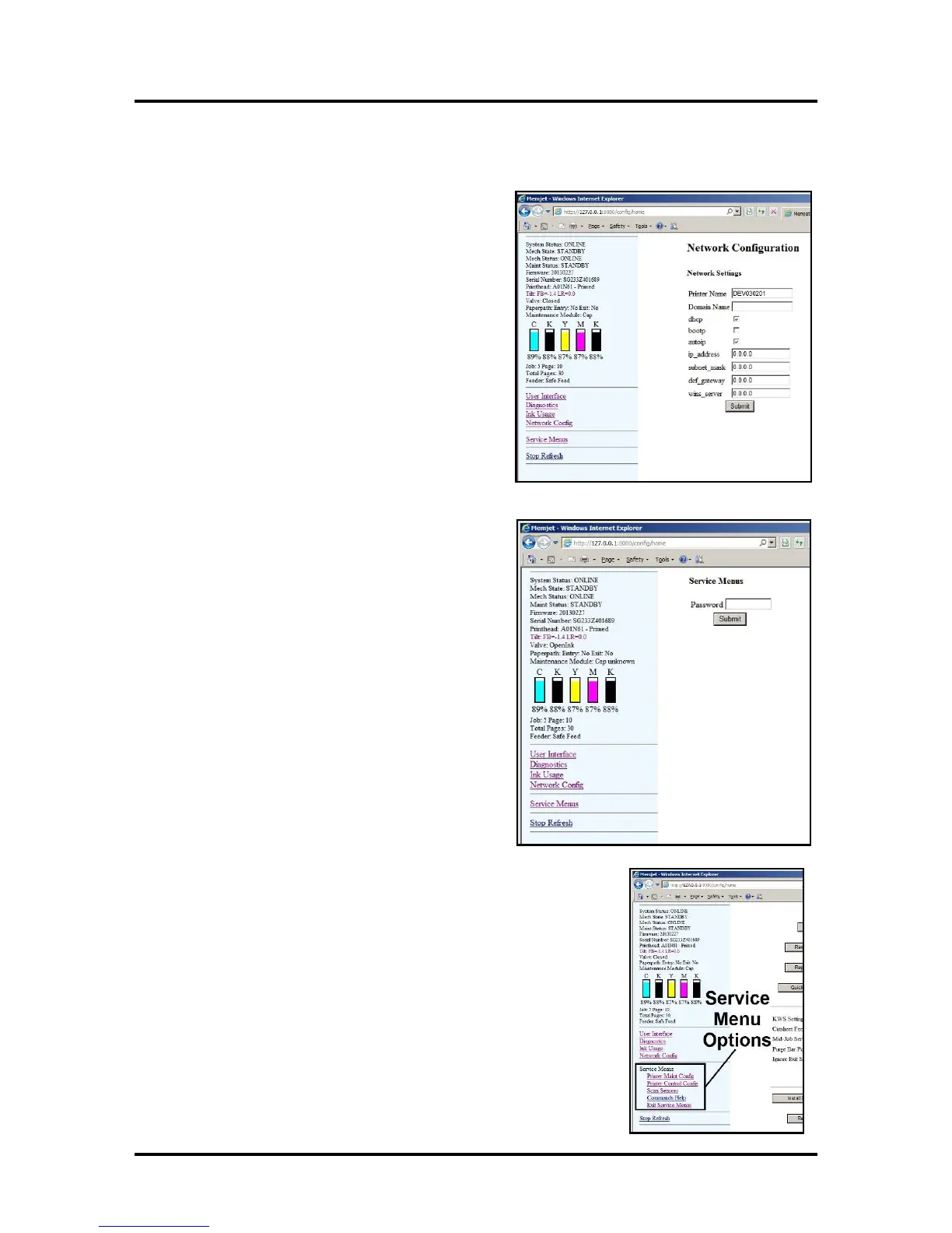Maint Config,” “Printer Control Config,” “Scan Sensors,” “Commands