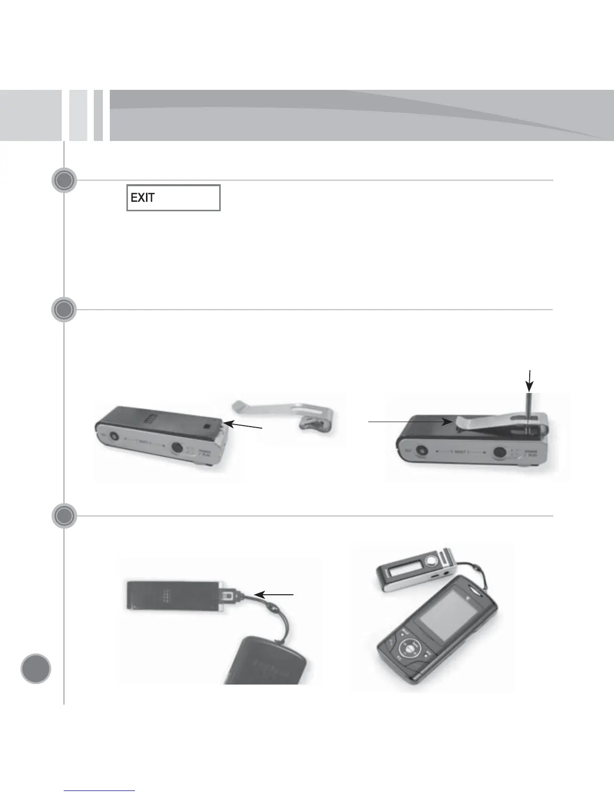 Disassembling : Press and hold the snapping part at the inside of the clip hole with the