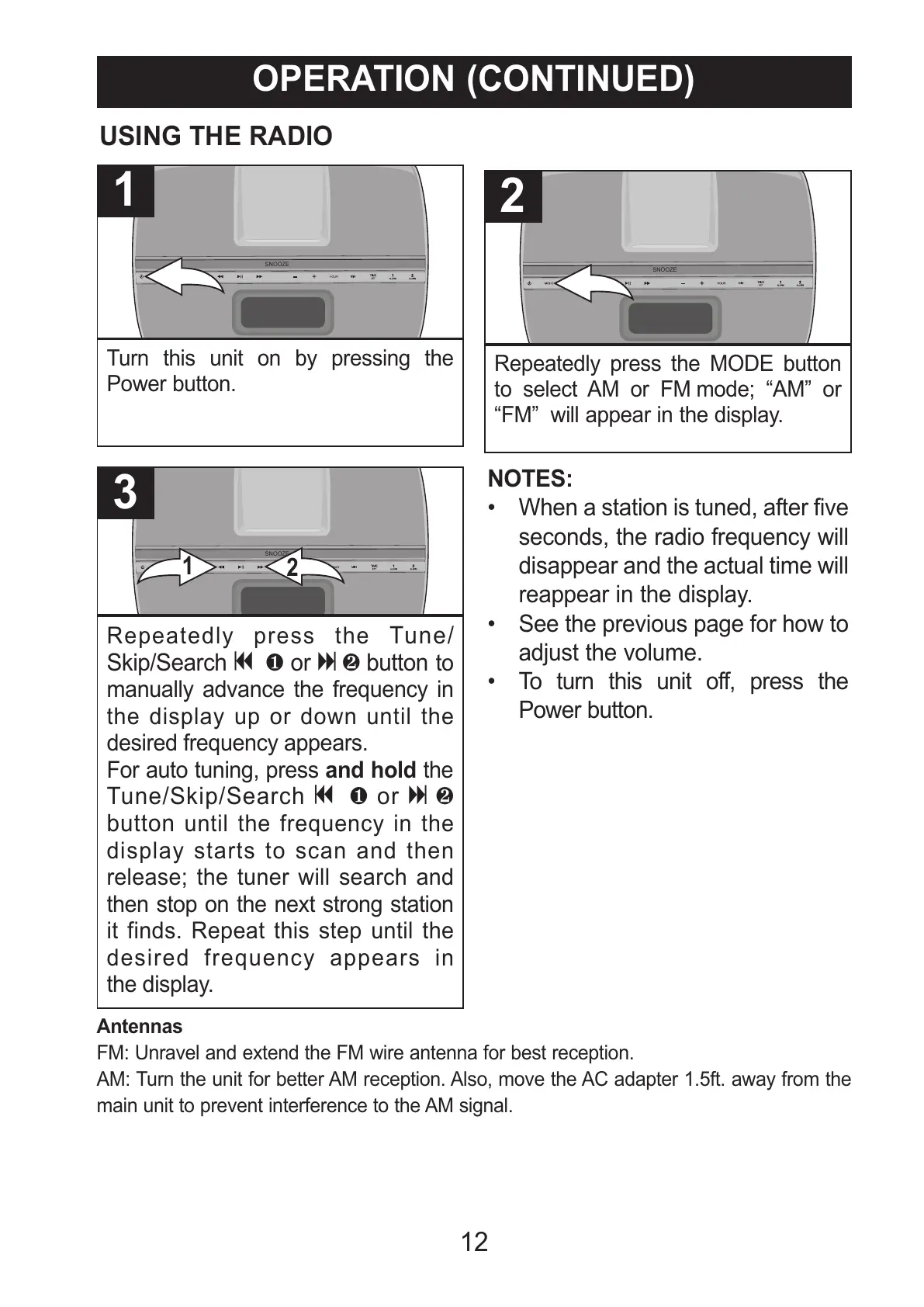 AM: Turn the unit for better AM reception. Also, move the AC adapter 1.5ft. away from the