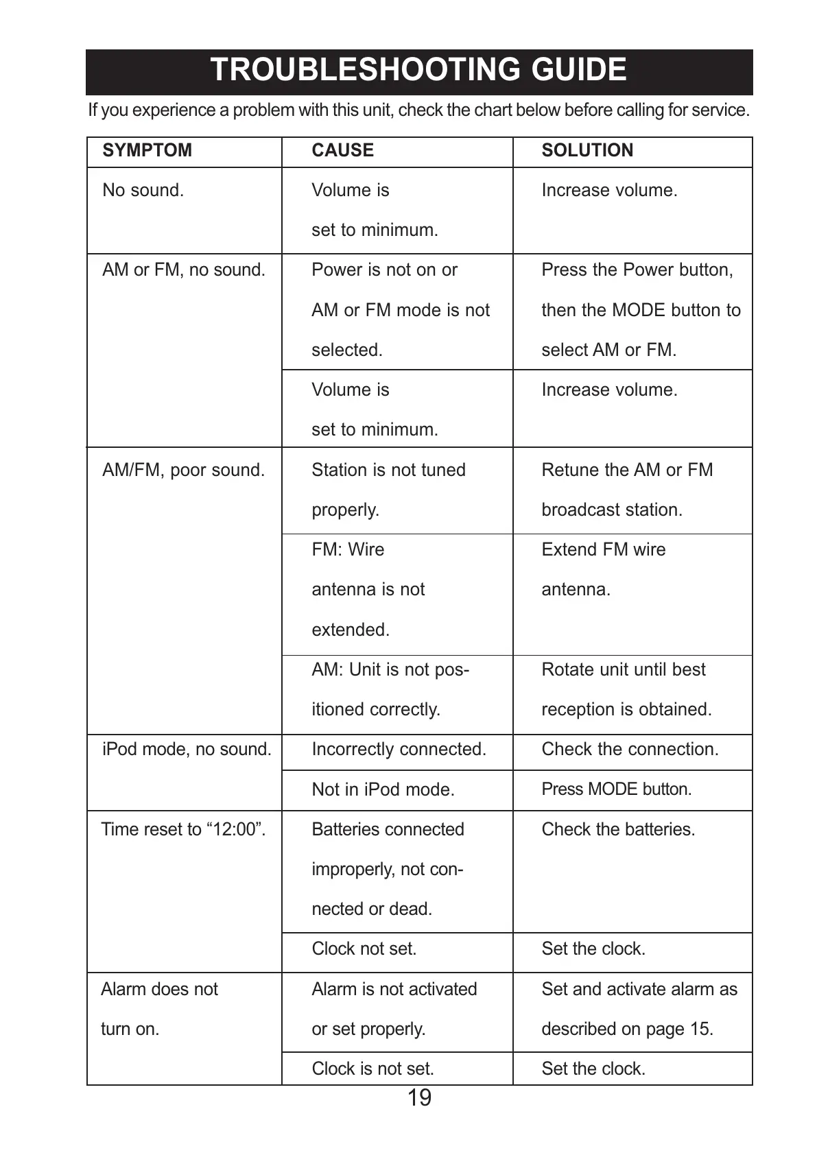 If you experience a problem with this unit, check the chart below before calling for service.