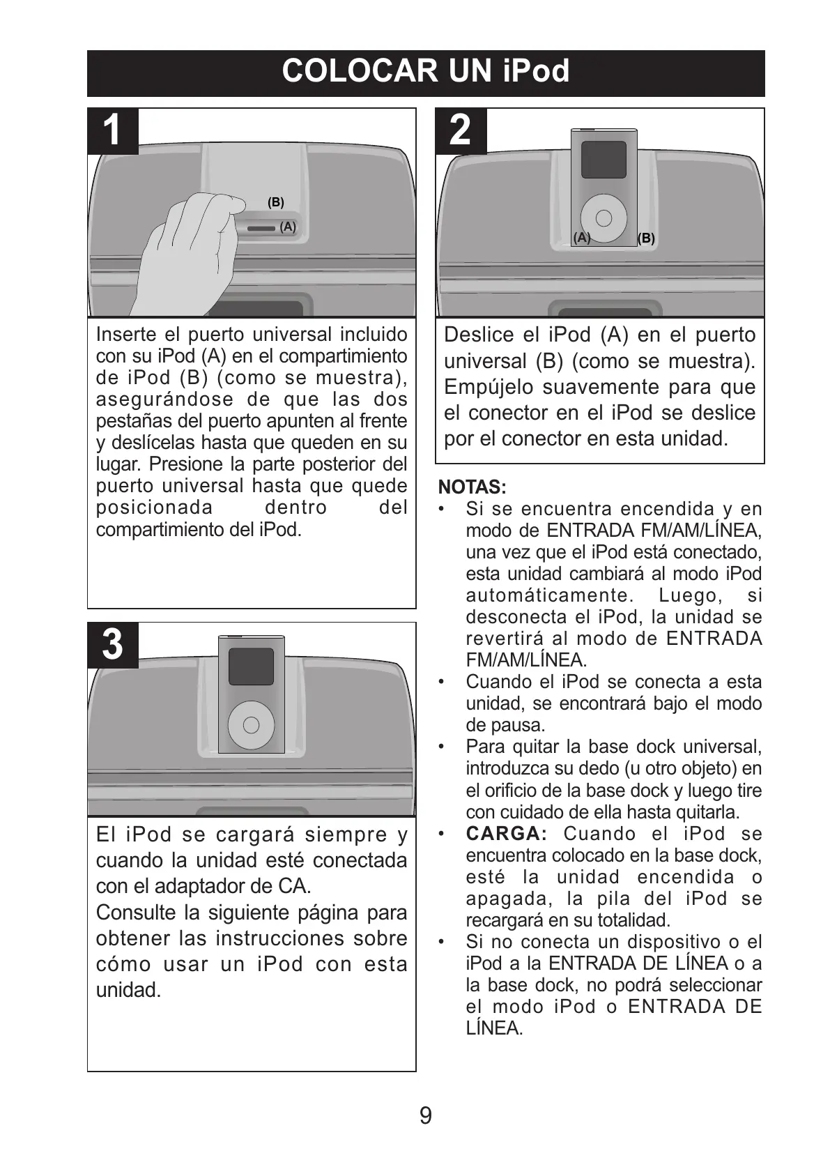 Deslice el iPod (A) en el puerto
