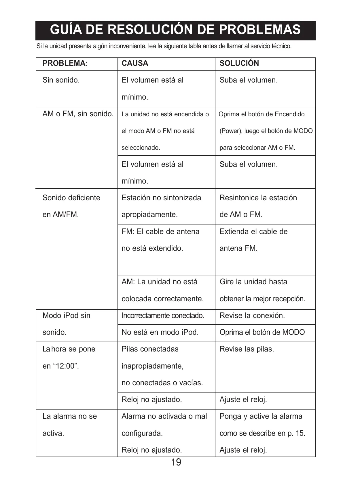 Si la unidad presenta algún inconveniente, lea la siguiente tabla antes de llamar al servicio técnico.