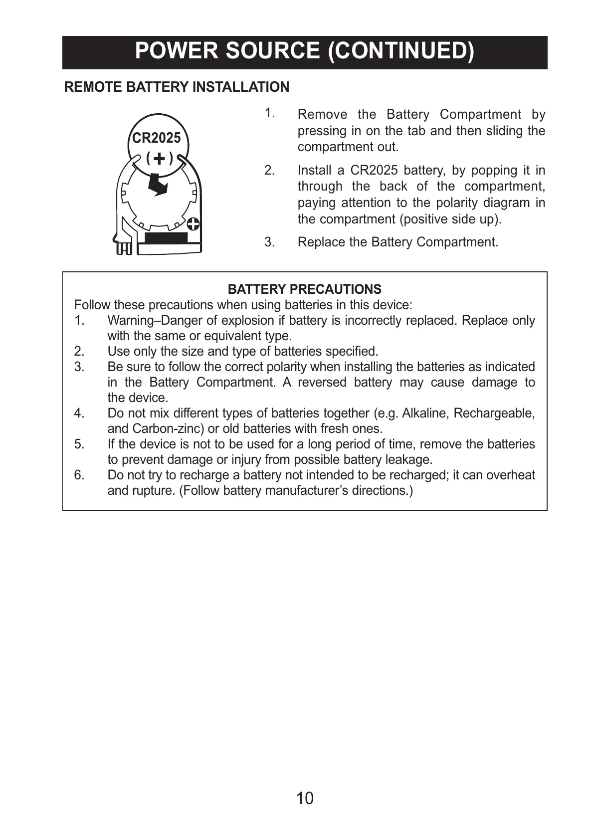 in the Battery Compartment. A reversed battery may cause damage to