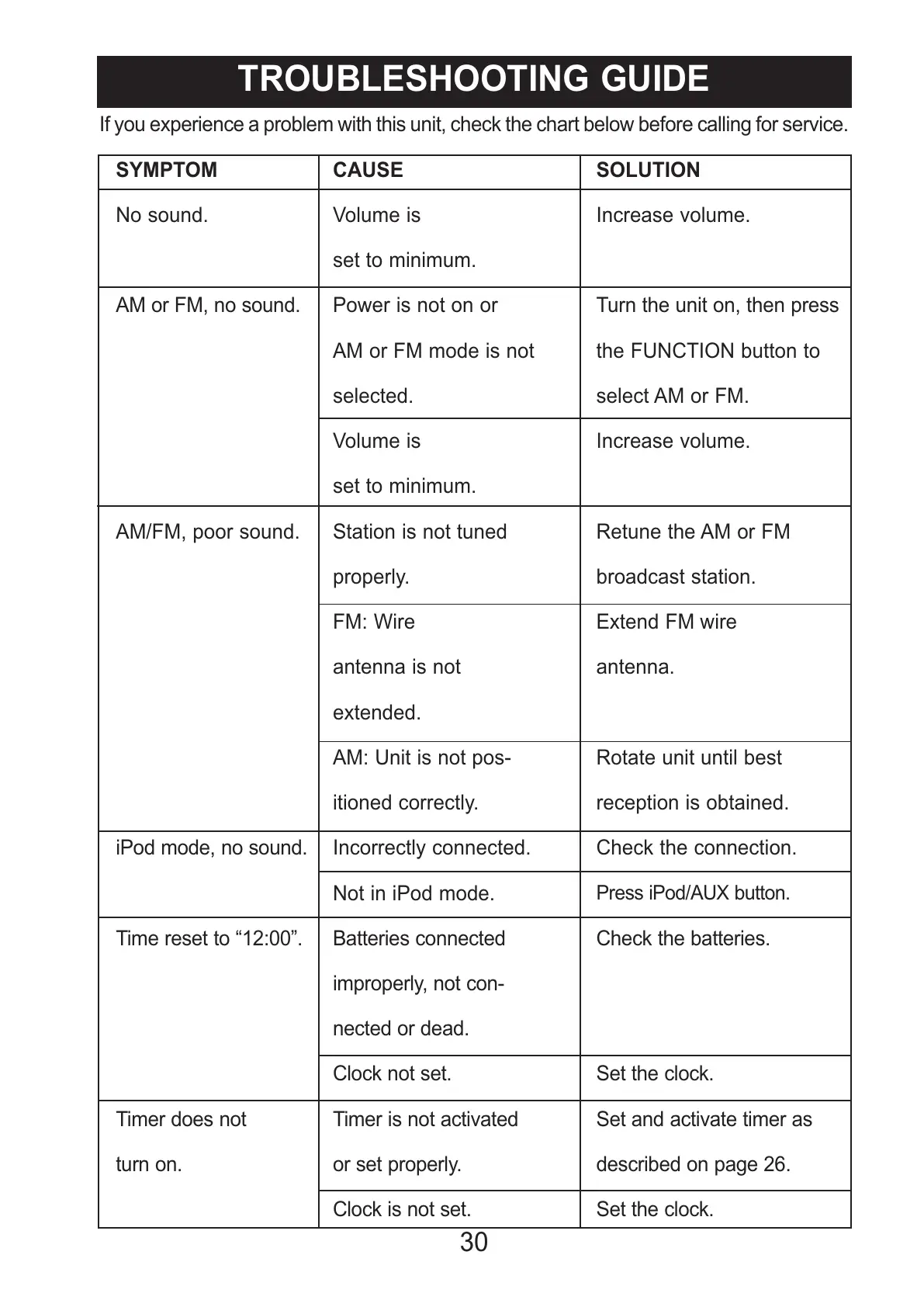 AM or FM, no sound. Power is not on or Turn the unit on, then press