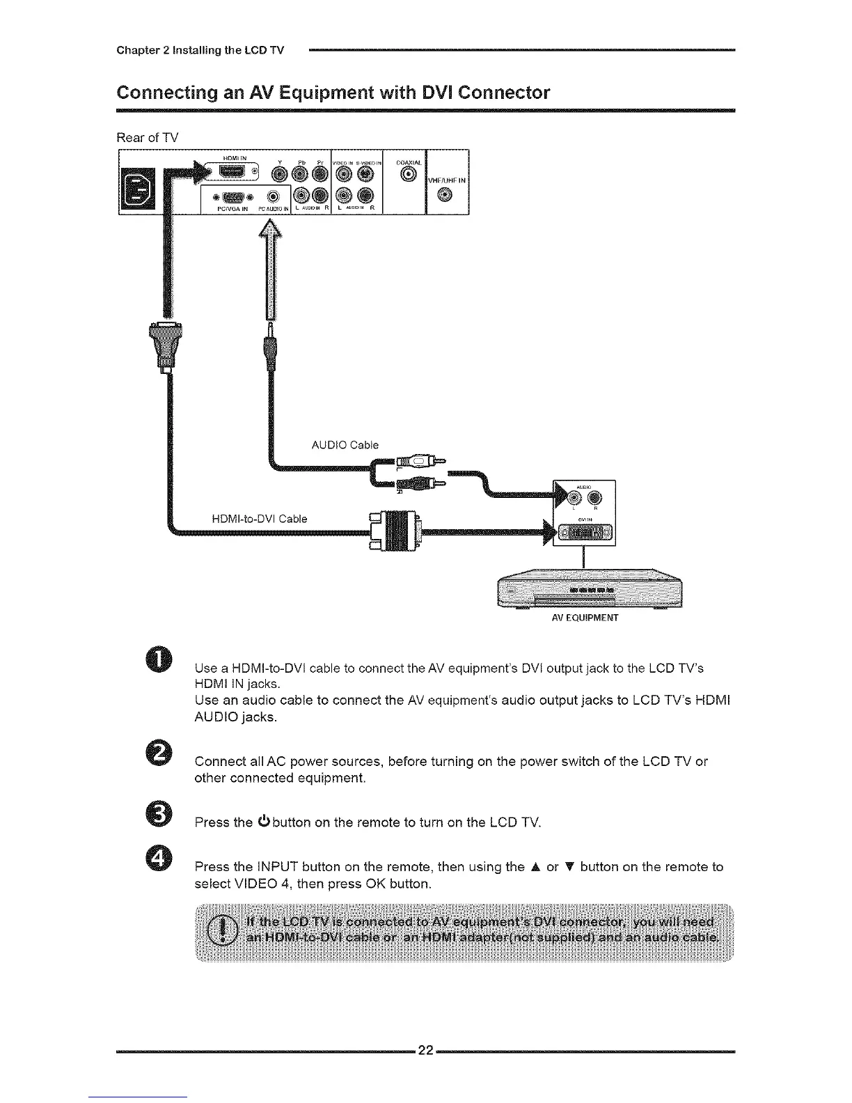 Use a HDMI-to-DVl cable to connect the AV equipment's DVl output jack to the LCD TV's