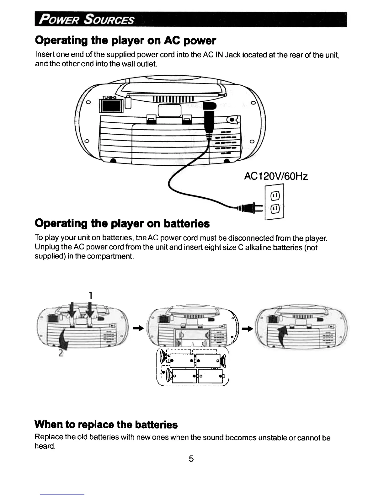 To play your unit on batteries, the AC power cord must be disconnected from the player.