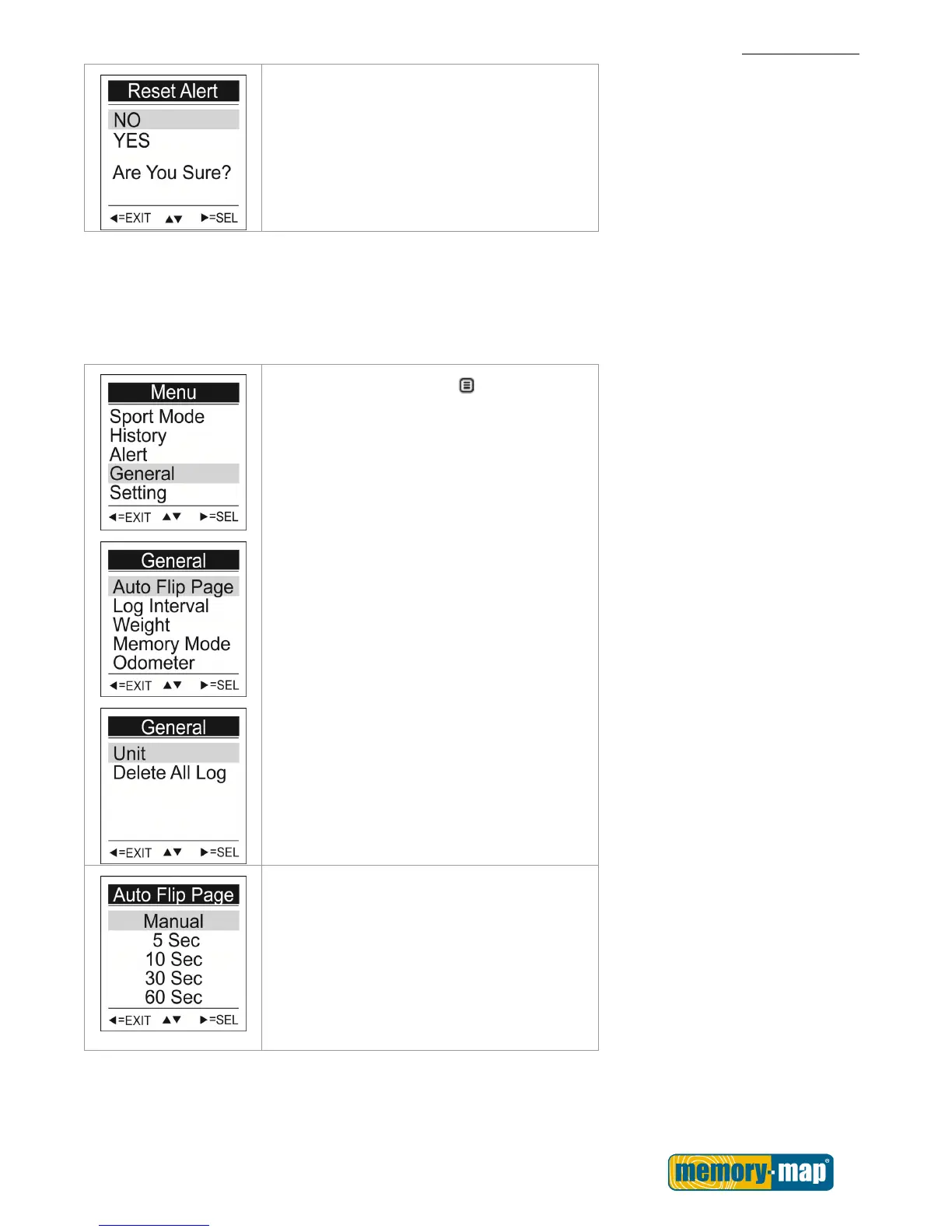 General submenu contains auto flip page, log interval, weight, memory mode, odometer, unit, and delete all