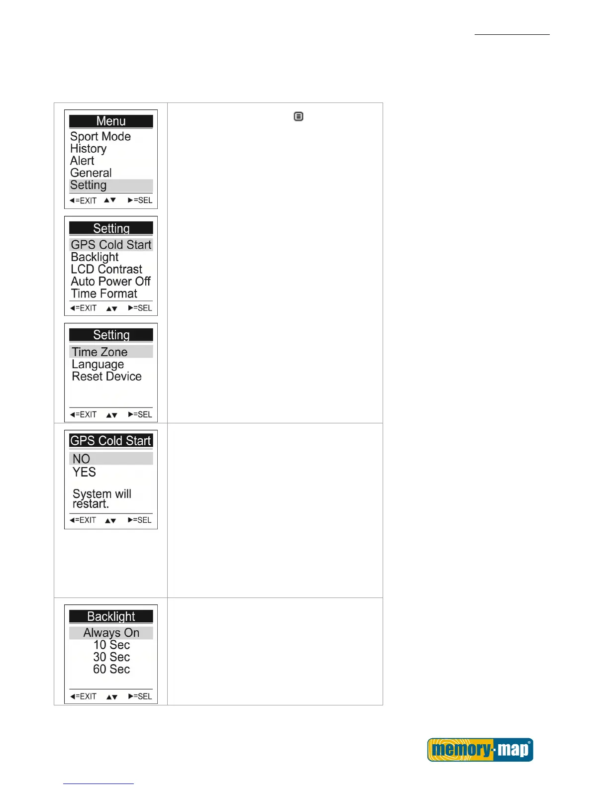 Setting submenu contains GPS cold start, Backlight, LCD contrast, Auto power off, Time format, Time zone,