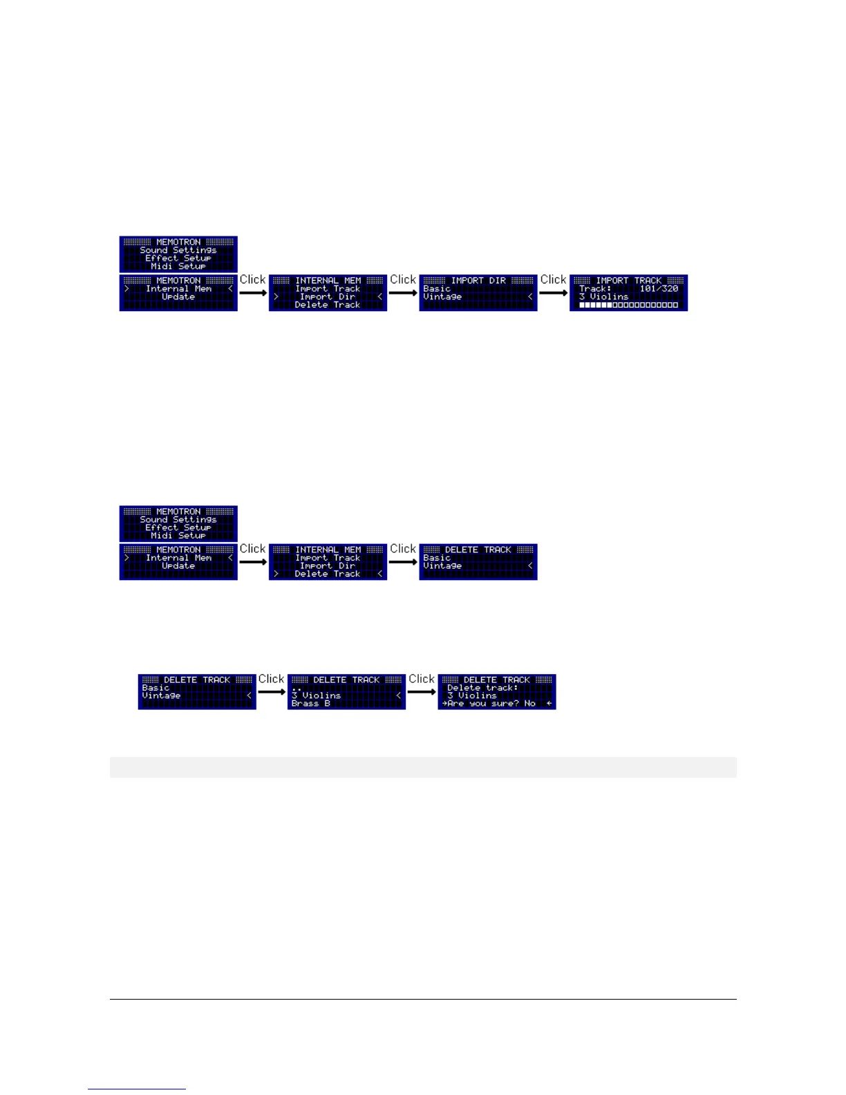 To delete individual tracks from the Memotron m2k's internal memory, first go to the "Internal Mem" menu. By