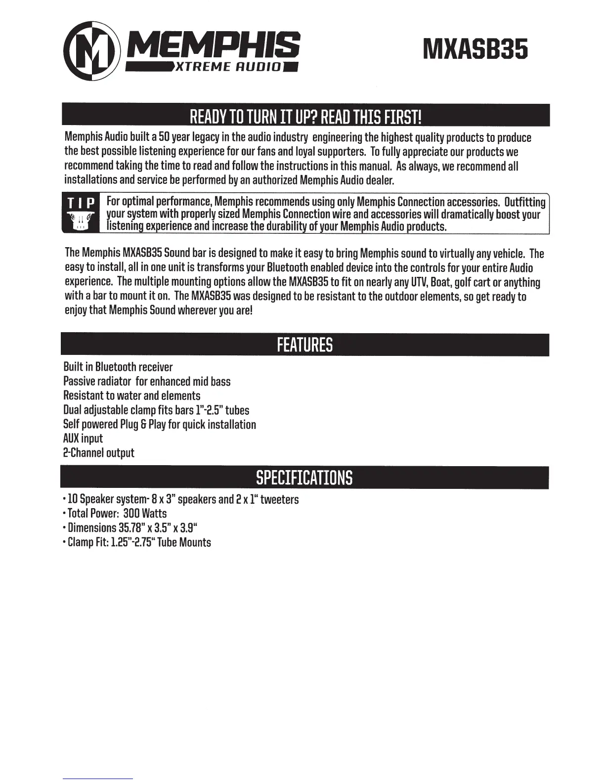 Memphis MKASB35 - Product Features; Product Specifications