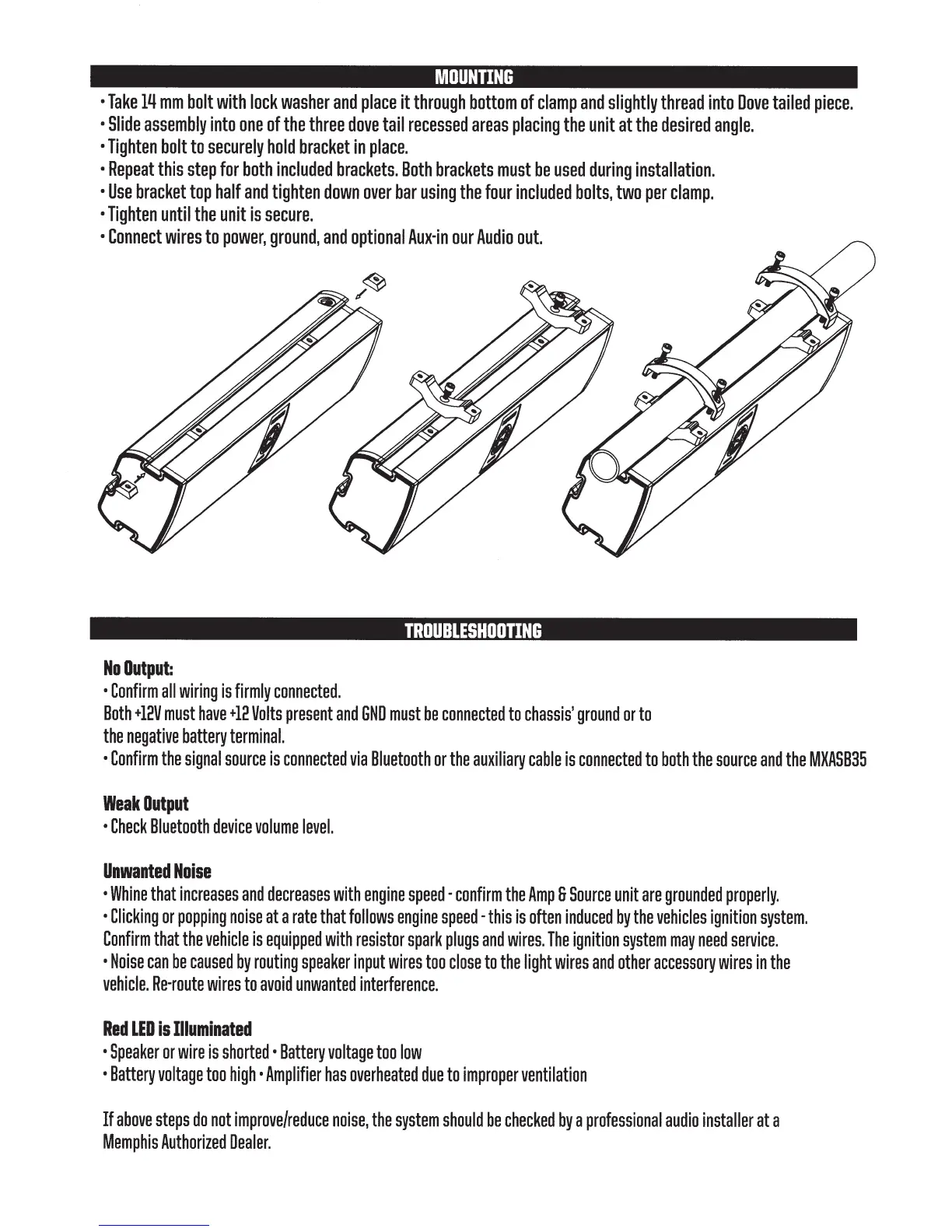 Memphis MKASB35 - Mounting Instructions; Troubleshooting Common Issues; Troubleshooting: No Audio Output; Troubleshooting: Weak Audio Output