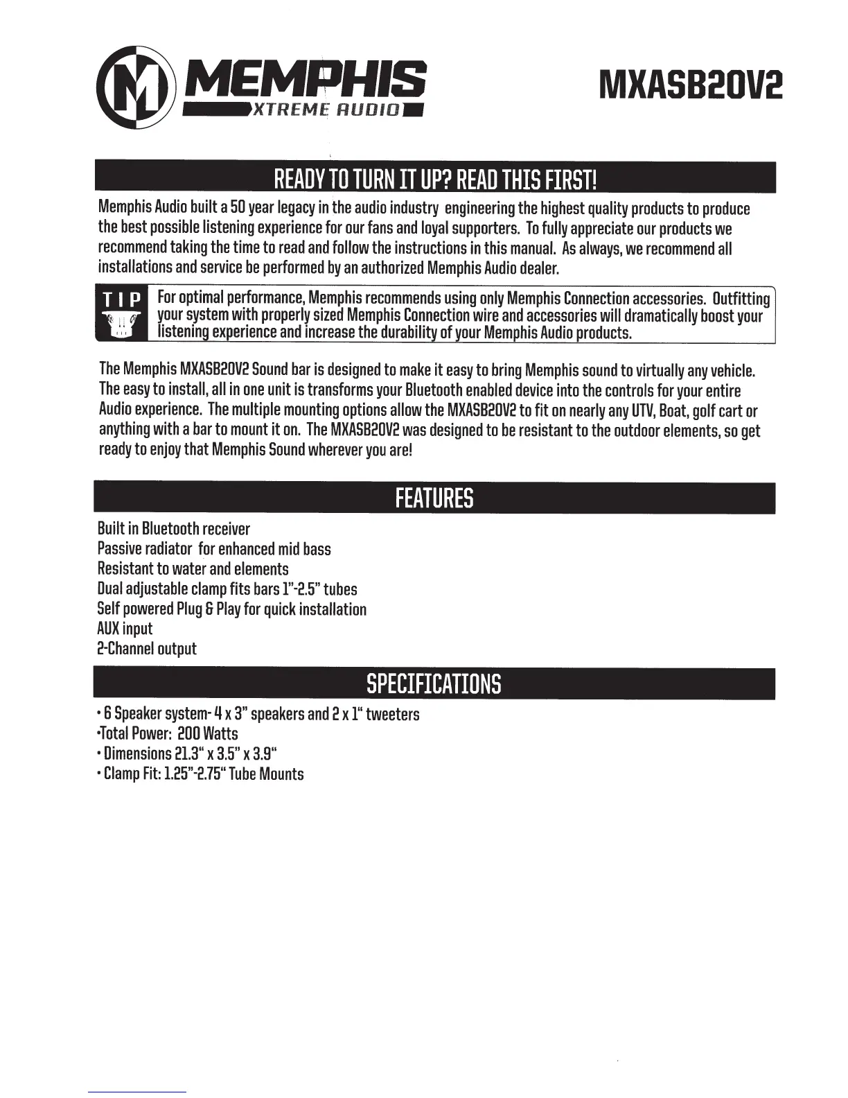 Memphis MXASB20V2 - Features; Key Features Overview; Specifications; Product Specifications