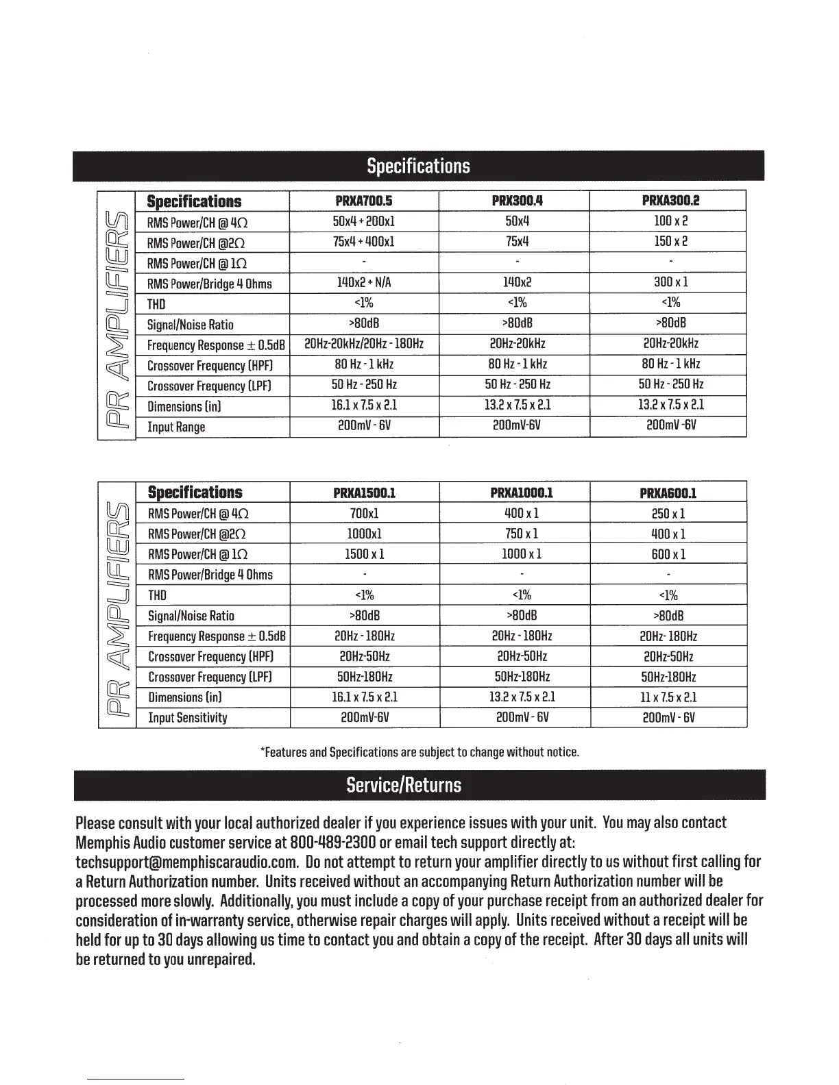 Memphis Power Reference Series - Product Specifications; PR Amplifiers Specifications; Mono Amplifiers Specifications; Service and Returns Policy