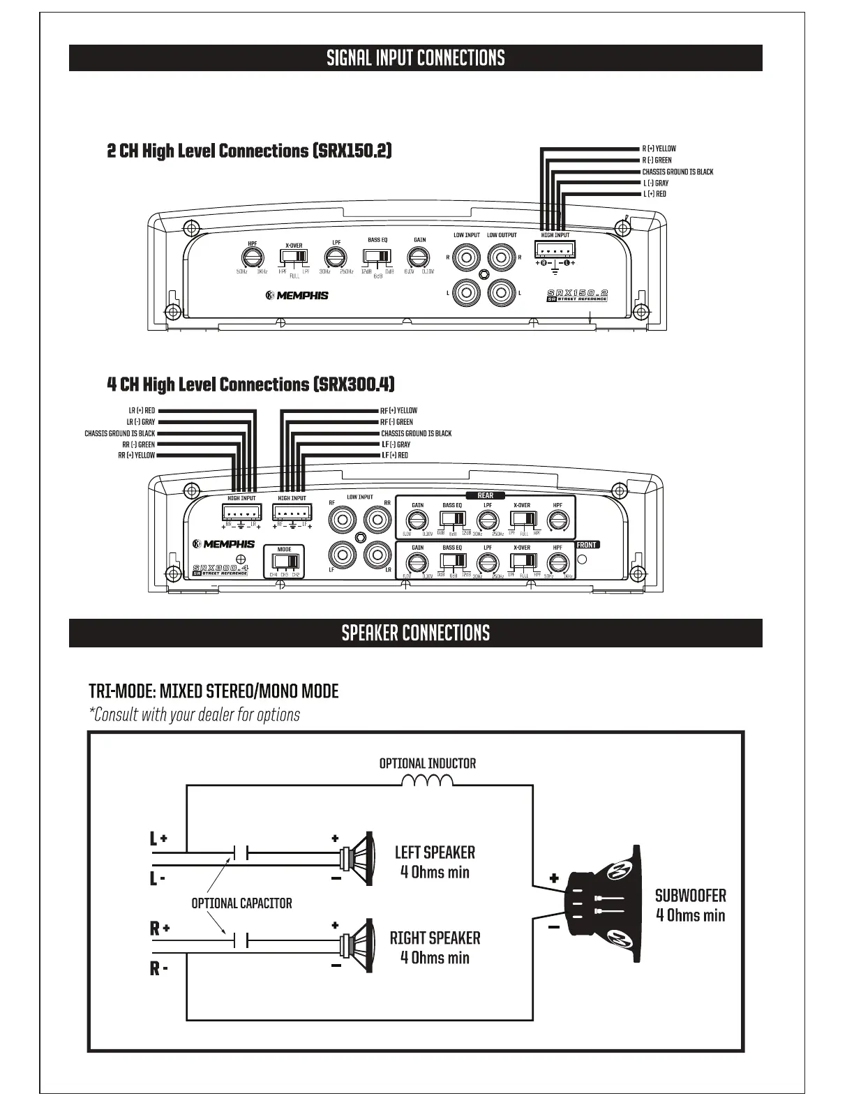 Memphis SRX150.2 - Signal and Speaker Connection Diagrams; High Level Input Wiring Examples; Speaker Output Terminal Guide