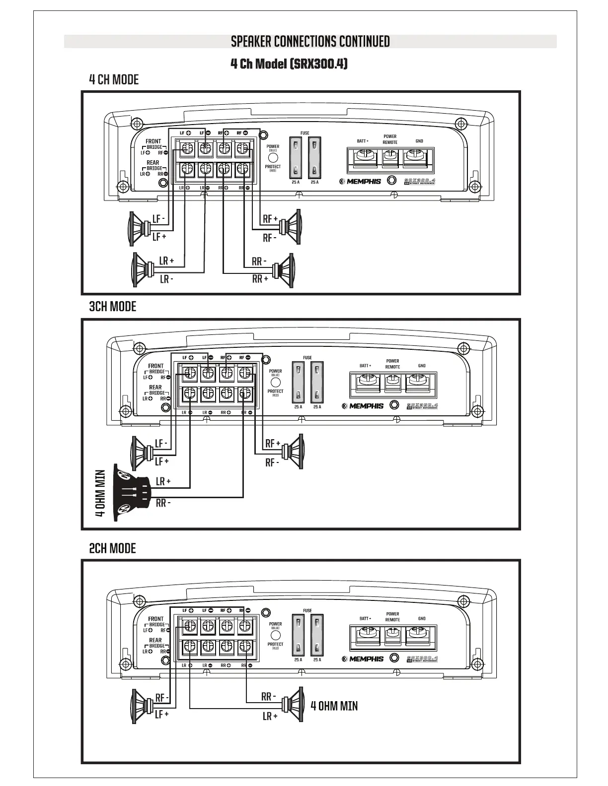 Memphis SRX150.2 - SRX300.4 Speaker Wiring Modes; 4 Channel Mode Wiring; 3 Channel Mode Wiring; 2 Channel Mode Wiring