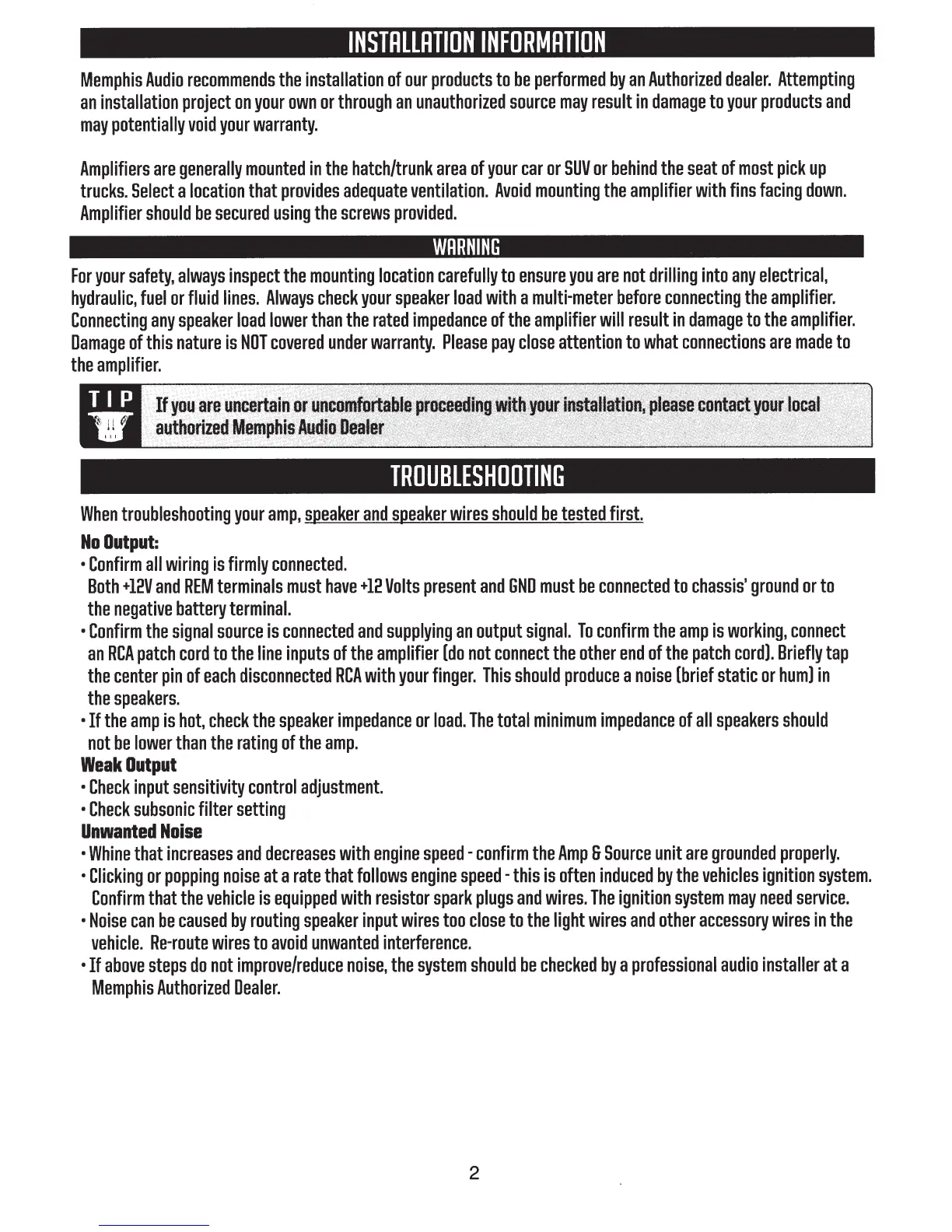 Memphis SRX500D.1 - Installation Information; Installation Warnings; Troubleshooting Common Issues; No Output or Weak Output