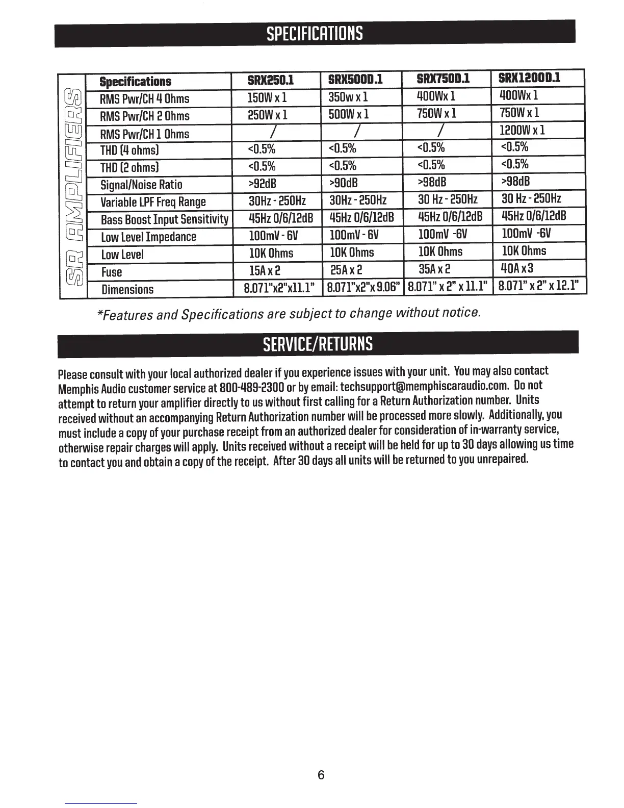 Memphis SRX500D.1 - Product Specifications; Technical Specifications Summary