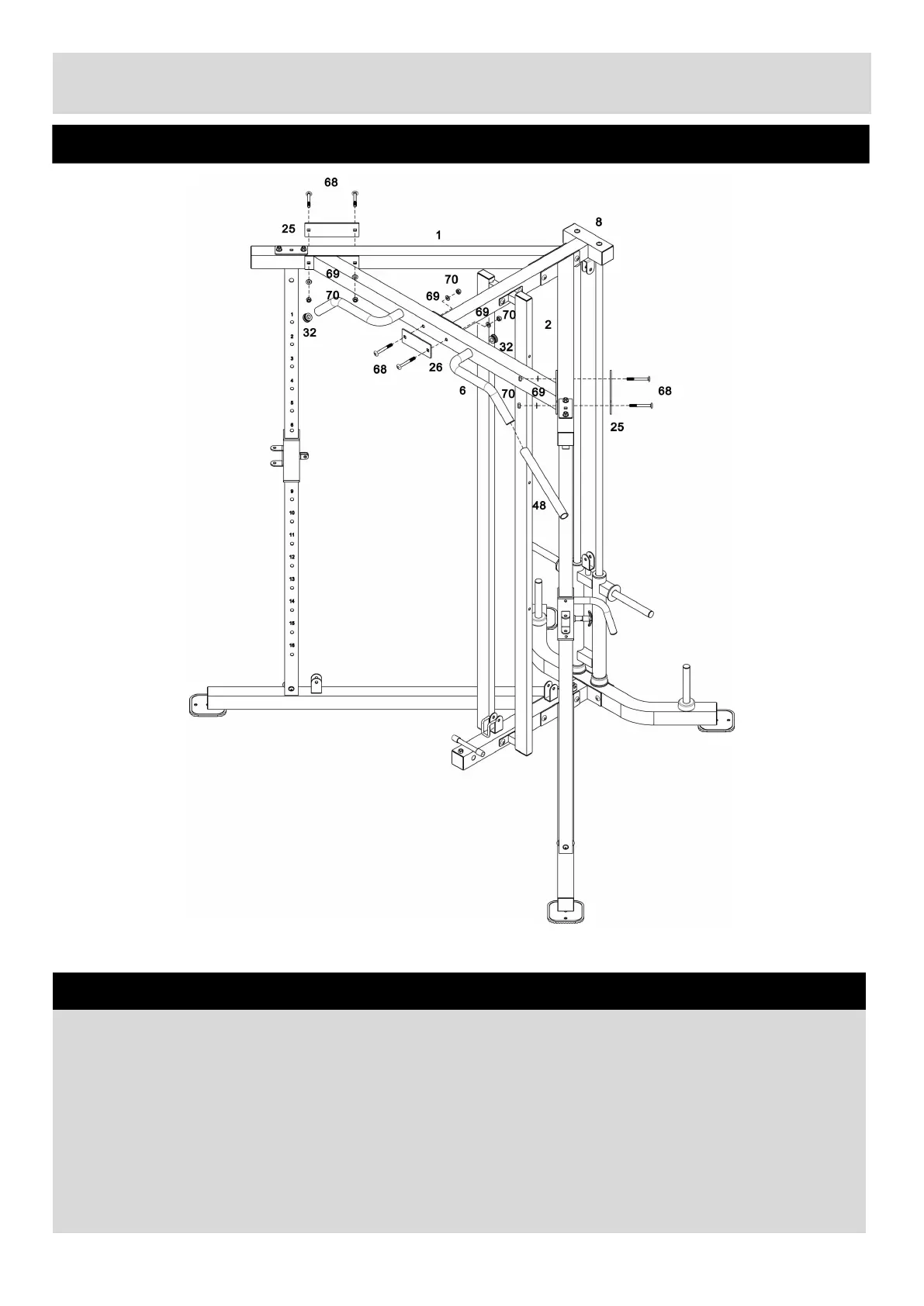 a. Attach the Upper Bar (6) to the Upper Frame (8) using 2 × M10×80mm Carriage Bolts (68), 2 ×