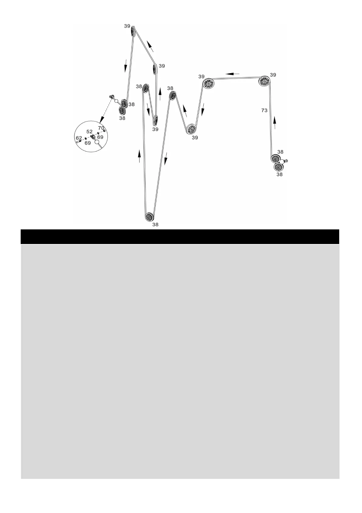 f. Thread the Upper Cable (73) through the the Load Frame (16), and fix 1 x Ø78 Pulley (38) using 1 x