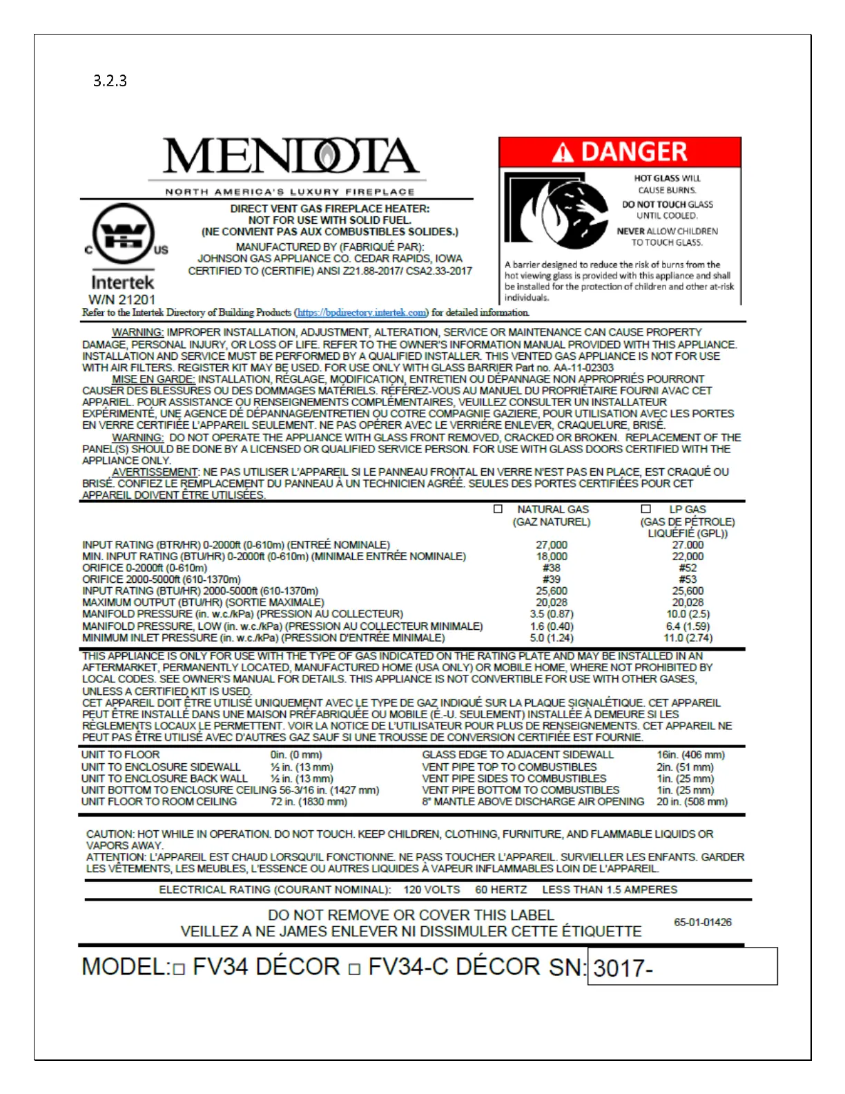 The listing label is in the air gap below the Fireplace. It is secured to a chain and left loosely in the air gap and can be pulled out