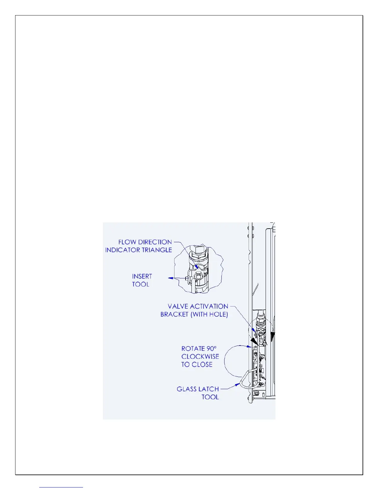 of the glass frame. Use the glass latch tool to operate the shutoff ball valve. If local building codes require,