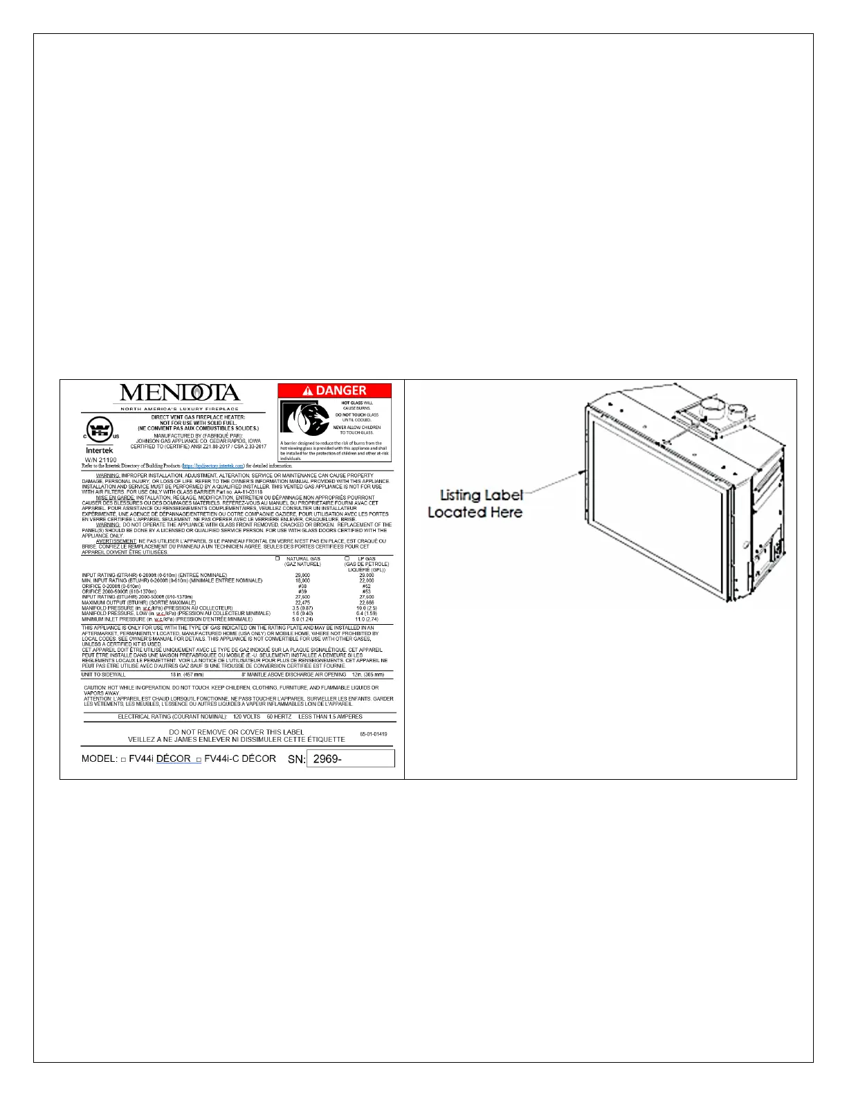 Listing label location: The listing label is located in the air gap on the left side of the Insert between the glass frame side and the