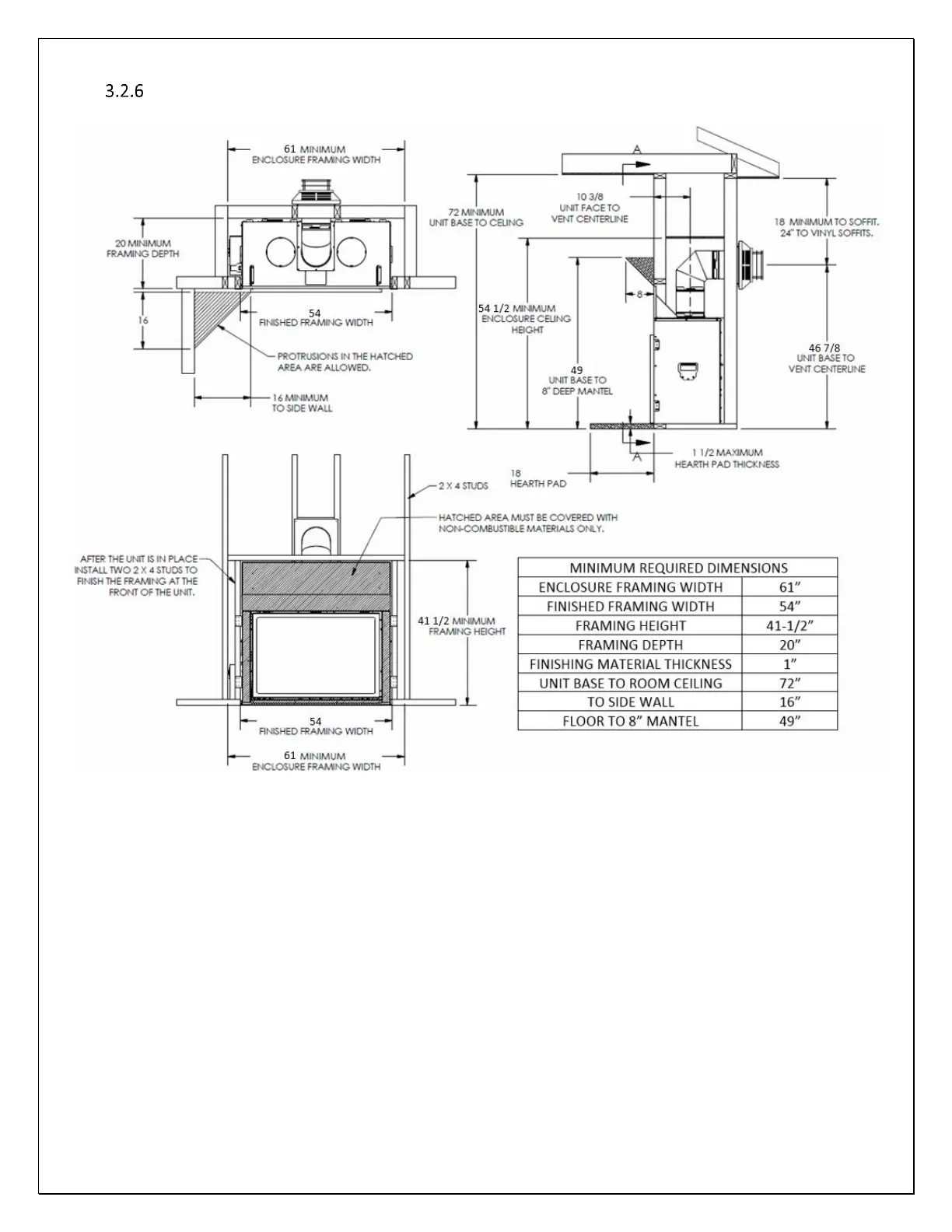 Note: For every 1” this fireplace is raised off the floor, the non-combustible hearth protection pad may be reduced by 2”. If
