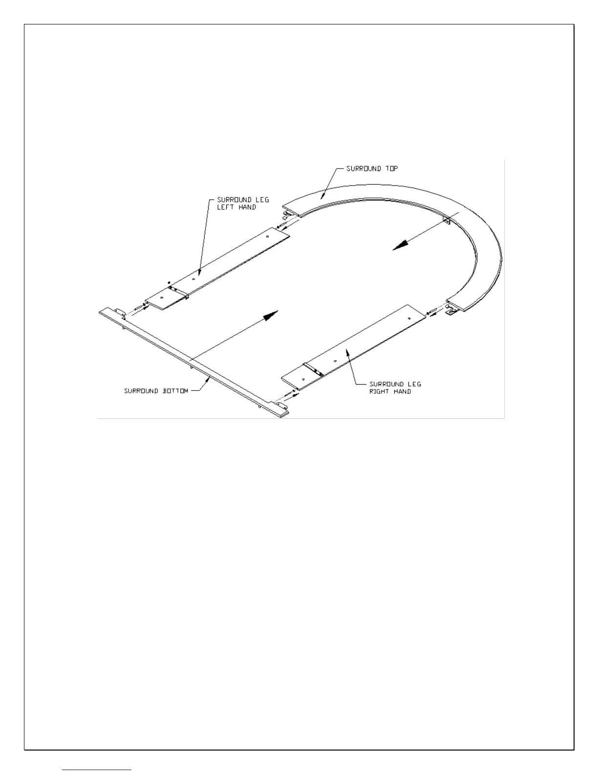 8. Align Hinge pinholes in Surround Bottom with the Bottom Hinge Pins in the Surround Legs. Slide Surround Bot-tom over the