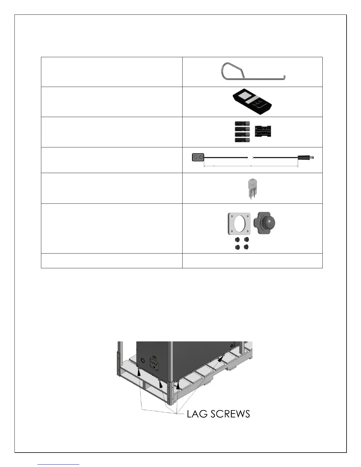 The Fireplace body is bolted to the pallet top surface using 5/16” X 1” Lag Screws in three points. One on each side and one or