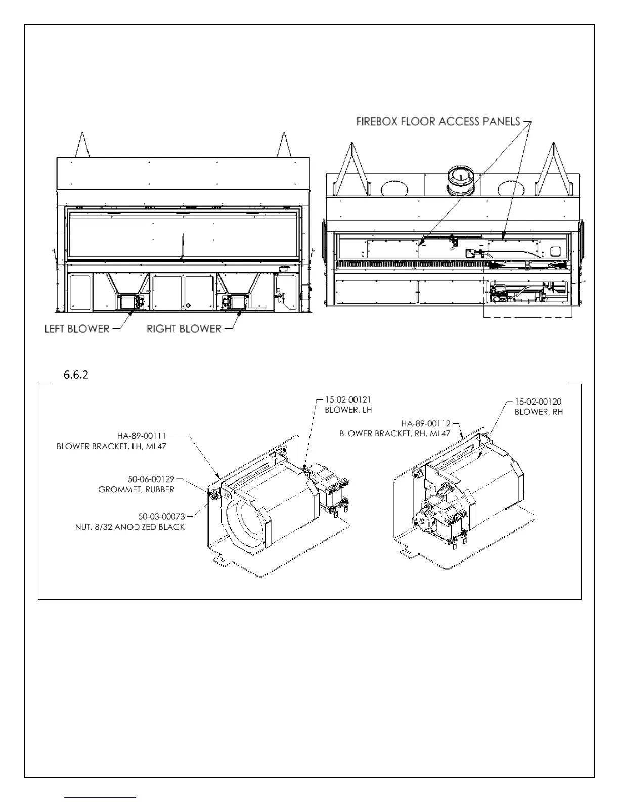 panels towards the rear of the fireplace. The blower assemblies are attached to the floor with two nuts. Remove the nuts and lift