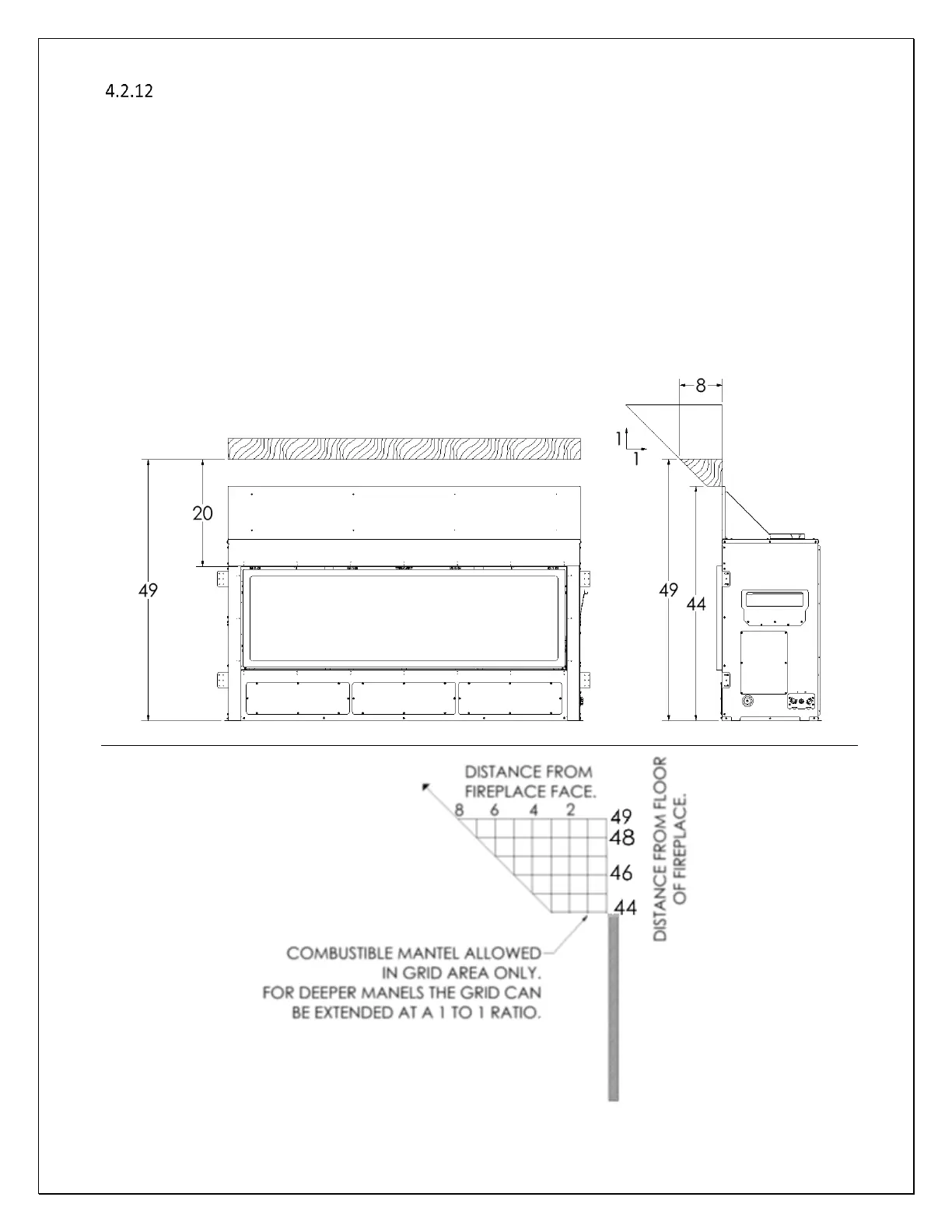 An 8” combustible mantel may be installed at a minimum of 49" above the floor level of this Fireplace. Non-combustible