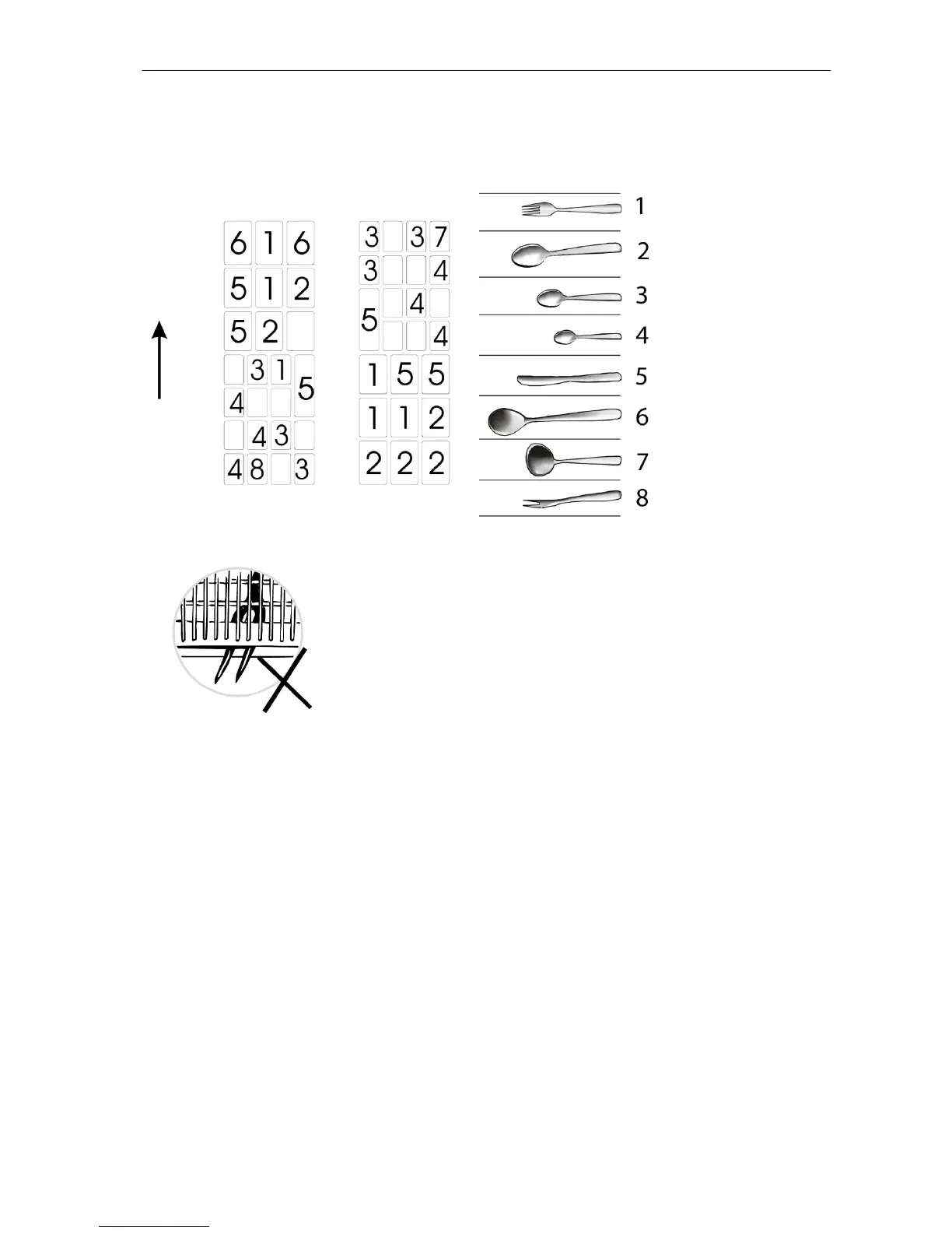 Sztućce należy umieścić w koszyku na sztućce rękojeściami do góry. Długie przedmioty, jak łyżki do