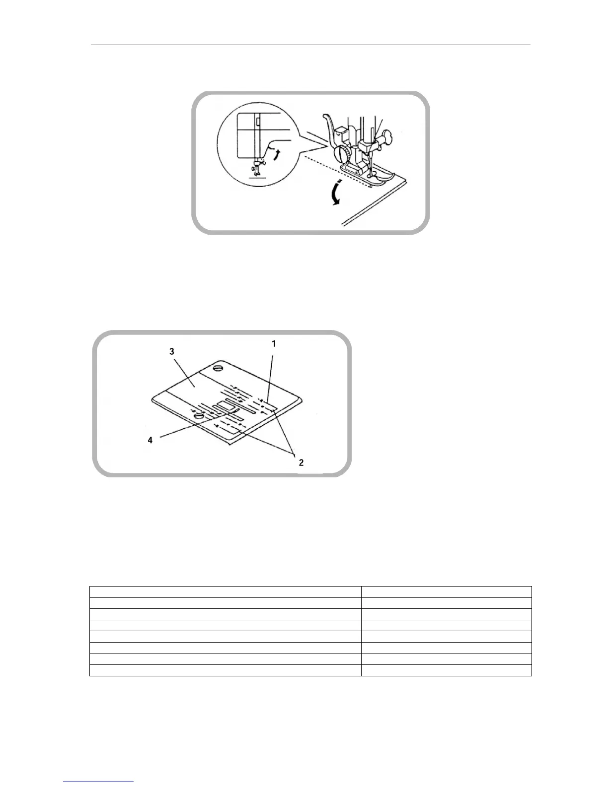 in inches. The following table shows the link between the figures on the stitch plate and the seam