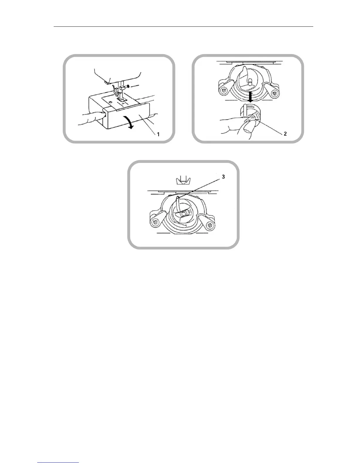 2. Vrid handhjulet mot dig tills nålen står i högsta läge. Håll spolkapseln i regeln 2 och dra den rakt ut.